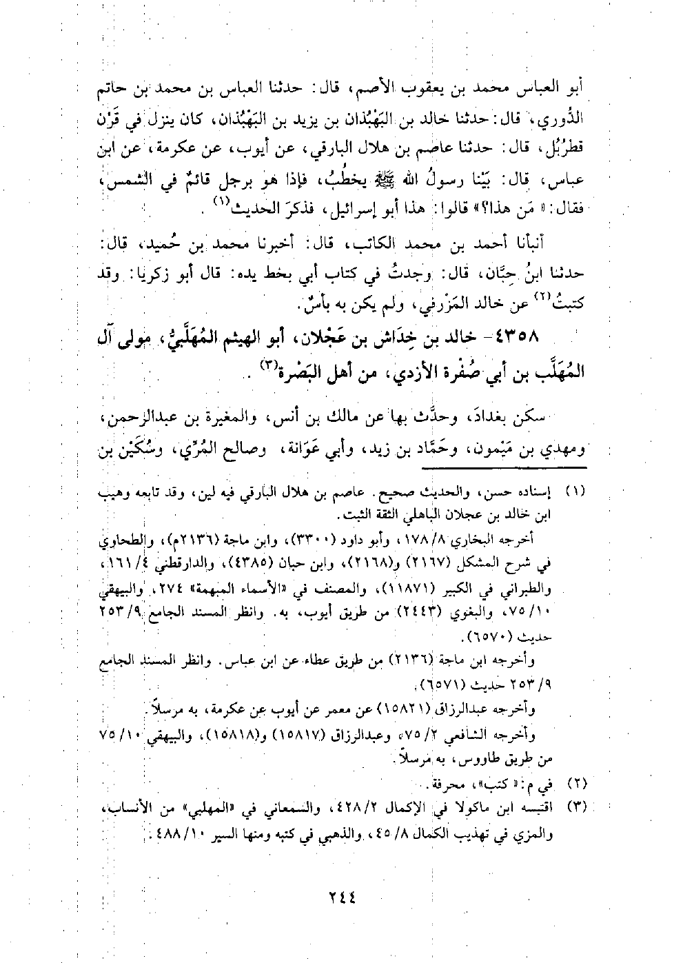 4358 - خَالِد بْن خداش بْن عجلان أَبُو الهيثم المهلبي مولى آل المهلب بْن أَبِي صفرة الأزدي من أَهْل الْبَصْرَة سكن بَغْدَاد، وَحدث بها عَنْ مَالِك بْن أَنَس، وَالمغيرة بْن عَبْد الرَّحْمَنِ، وَمهدي بْن ميمون، وَحماد بْن زيد، وَأبي عوانة، وَصالح المري، وَسكين بْن عَبْد العزيز، وَعبد اللَّه بْن وَهب.