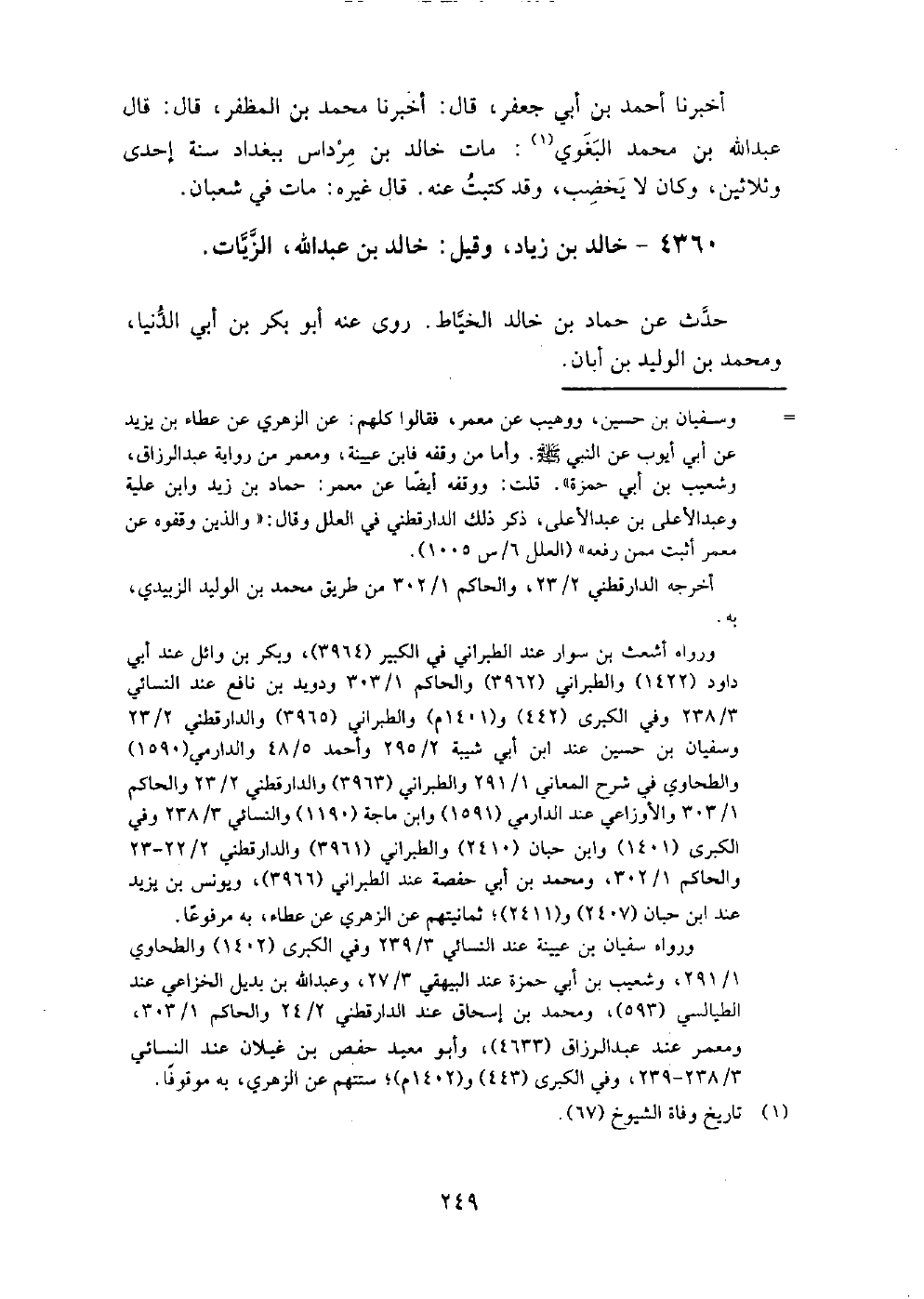 4360 - خَالِد بْن زِيَاد وَقيل خَالِد بْن عَبْد اللَّهِ الزيات حدث عَنْ حَمَّاد بْن خَالِد الْخَيَّاط.