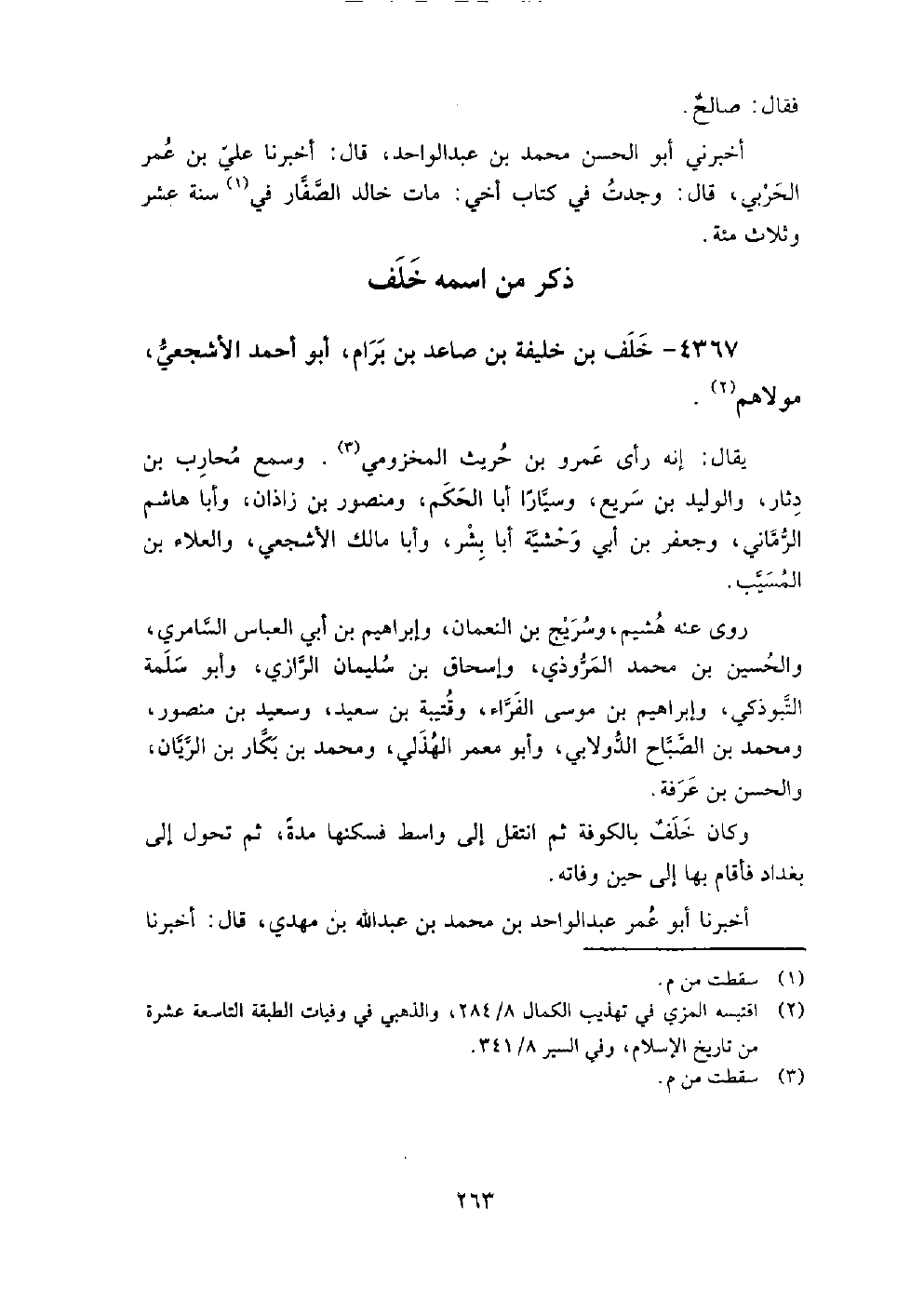وَأَخْبَرَنَا مُحَمَّدُ بْنُ عَبْدِ الْوَاحِدِ الأَكْبَرُ، قَالَ: أَخْبَرَنَا عُبَيْدُ اللَّهِ بْنُ عَبْدِ الرَّحْمَنِ بْنِ مُحَمَّدٍ الْقُرَشِيُّ، قَالَ: أَخْبَرَنَا مُحَمَّدُ بْنُ هَارُونَ بْنِ حُمَيْدٍ، قَالَ: حَدَّثَنَا مُحَمَّدٌ بَكَّارُ بْنُ الرَّيَّانِ، قَالَ: حَدَّثَنَا خَلَفُ بْنُ خَلِيفَةَ، قَالَ: رَأَيْتُ عَمْرَو بْنَ حُرَيْثٍ وَأَنَا ابْنُ سَبْعِ سِنِينَ، وَقَالَ ابْنُ حُمَيْدٍ: ابْنُ خَمْسِ سِنِينَ، " خَرَجَ مِنْ دَارِهِ وَدخَلَ دَارَ الْعَلاكِينَ، وَقَالَ ابْنُ حُمَيْدٍ: الْعَلافِينَ، بِالْكُوفَةِ " أَخْبَرَنَا مُحَمَّد بْن الْحُسَيْن الأزرق، قَالَ: أَخْبَرَنَا عُثْمَان بْن أَحْمَد الدقاق، قَالَ: حَدَّثَنَا مُحَمَّد بْن هشام المستملي، قَالَ: سمعت عَبْد الرحيم بْن عُمَر البزاز، يقول: إنما كتب الناس عَنْ خلف بْن خليفة، لأن هشيما كَانَ يحدث فحدث، فَقَالَ حَدَّثَنِي شيخ من أشجع، قَالُوا: من هو يا أبا معاوية؟ قَالَ: خلف بْن خليفة، فذهبوا إليه أَخْبَرَنَا مُحَمَّد بْن عَبْد الواحد، قَالَ: أَخْبَرَنَا مُحَمَّد بْن الْعَبَّاس، قَالَ: أَخْبَرَنَا أَحْمَد بْن سَعِيد السوسي، قَالَ: حَدَّثَنَا عَبَّاس بْن مُحَمَّد، قَالَ: سئل يَحْيَى بْن معين عَنْ خلف بْن خليفة، فَقَالَ: ليس به بأس أَخْبَرَنَا علي بْن الْحُسَيْن، قَالَ: أَخْبَرَنَا عَبْد الرَّحْمَنِ بْن عُمَر الْخَلال، قَالَ: حَدَّثَنَا مُحَمَّد بْن إِسْمَاعِيل الفارسي، قَالَ: حَدَّثَنَا بَكْر بْن سهل، قَالَ: حَدَّثَنَا عَبْد الخالق بْن منصور، قَالَ: سئل يَحْيَى بْن معين عَنْ خلف بْن خليفة، فَقَالَ: ليس به بأس صدوق أَخْبَرَنَا الْبَرْقَانِيّ، قَالَ: أَخْبَرَنَا مُحَمَّد بْن عَبْد اللَّهِ بْن خميرويه، قَالَ: أَخْبَرَنَا الْحُسَيْن بْن إدريس، قَالَ: وَسألته، يعني مُحَمَّد بْن عَبْد اللَّهِ بْن عمار، عَنْ خلف بْن خليفة، فَقَالَ لا بأس به وَلم يكن صاحب حَدِيث حَدَّثَنِي مُحَمَّد بْن يوسف النيسابوري، قَالَ: حَدَّثَنَا الخصيب بْن عَبْد اللَّهِ الْقَاضِي بمصر، قَالَ: أَخْبَرَنَا عَبْد الكريم بْن أَبِي عَبْد الرَّحْمَنِ النسائي، قَالَ: أَخْبَرَنِي أَبِي، قَالَ: أَبُو أَحْمَد خلف بْن خليفة بغدادي كوفي الأصل، ليس به بأس أَخْبَرَنَا إِبْرَاهِيم بْن عُمَر البرمكي، قَالَ: أَخْبَرَنَا مُحَمَّد بْن عَبْد اللَّهِ بْن خلف الدقاق، قَالَ: حَدَّثَنَا عُمَر بْن مُحَمَّد الجوهري، قَالَ: حَدَّثَنَا أَبُو بَكْر الأثرم، قَالَ: وَسمعت أبا عَبْد اللَّهِ يسأل عَنْ خلف بْن خليفة، فَقَالَ: قد أتيته فلم أفهم عنه.