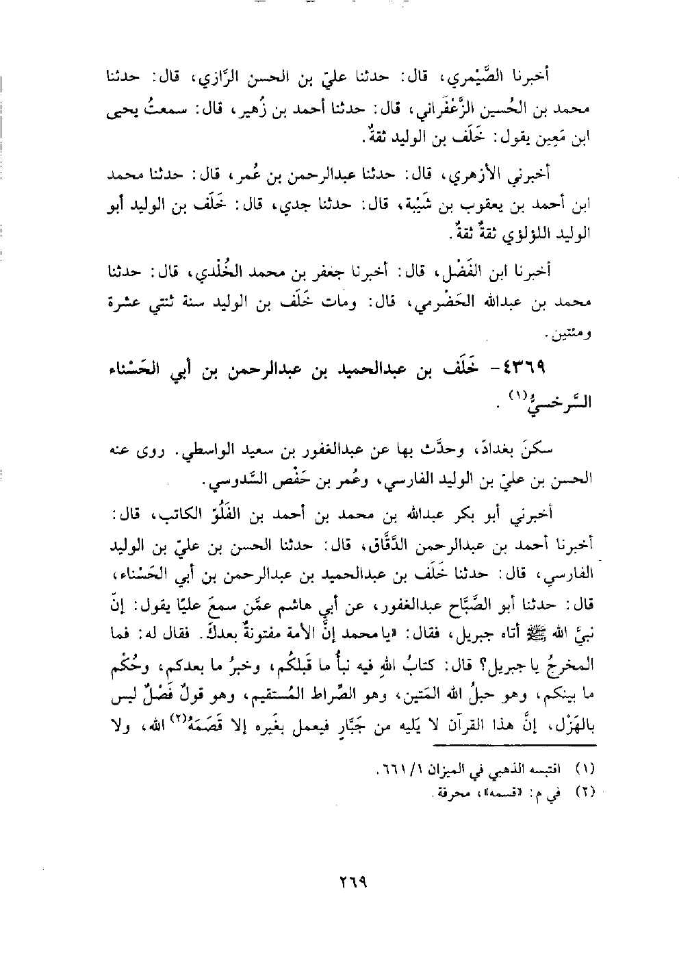 4369 - خلف بْن عَبْد الحميد بْن عَبْد الرَّحْمَنِ بْن أَبِي الحسناء السرخسي سكن بَغْدَاد، وَحدث بها عَنْ عَبْد الغفور بْن سَعِيد الواسطي.