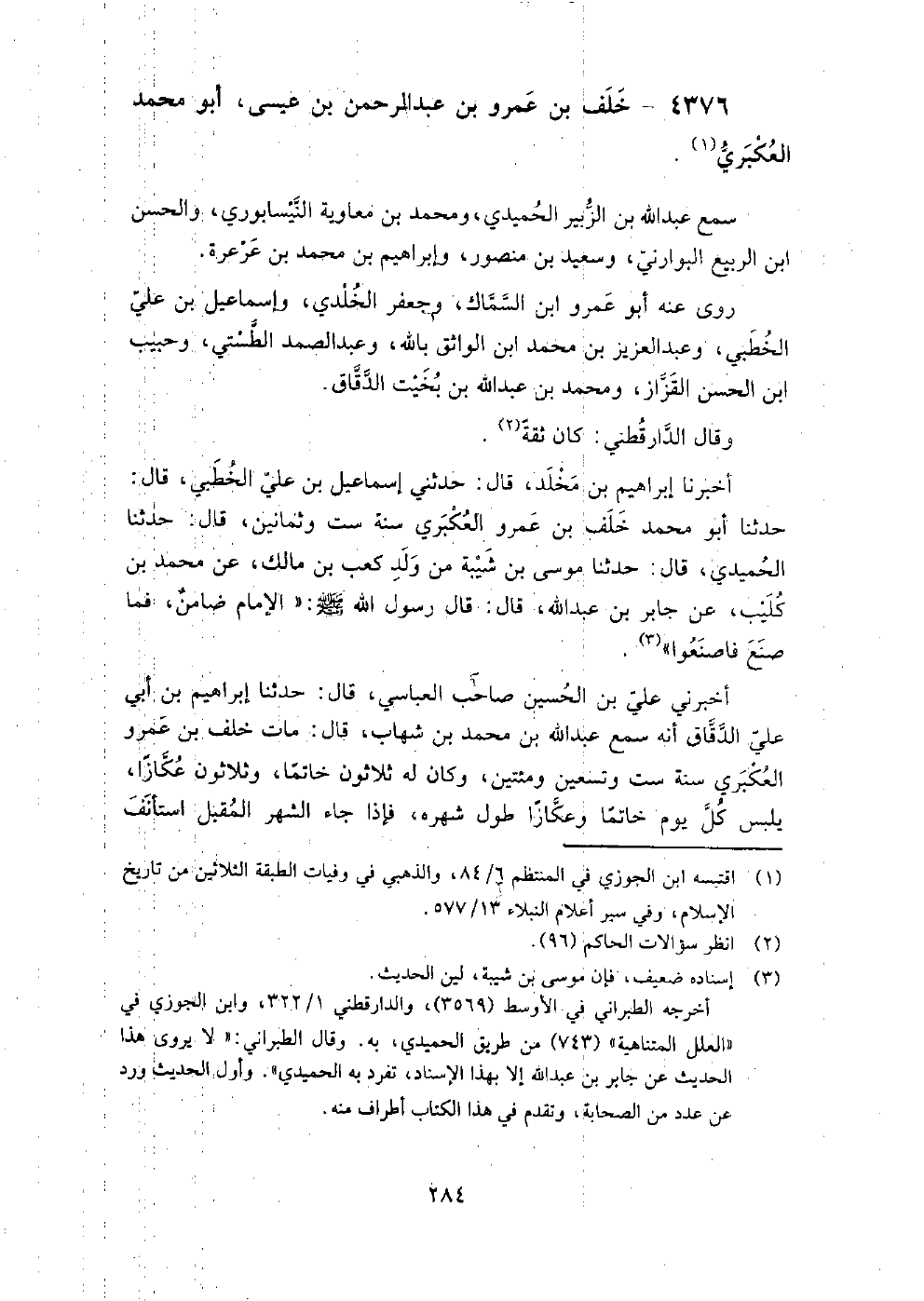 4376 - خلف بْن عَمْرو بْن عَبْد الرَّحْمَنِ بْن عيسى أَبُو مُحَمَّد العكبري سمع عَبْد اللَّهِ بْن الزبير الحميدي، وَمحمد بْن معاوية النيسابوري، وَالحسن بْن الربيع البوارني، وَسعيد بْن منصور، وَإِبْرَاهِيم بْن مُحَمَّد بْن عرعرة.