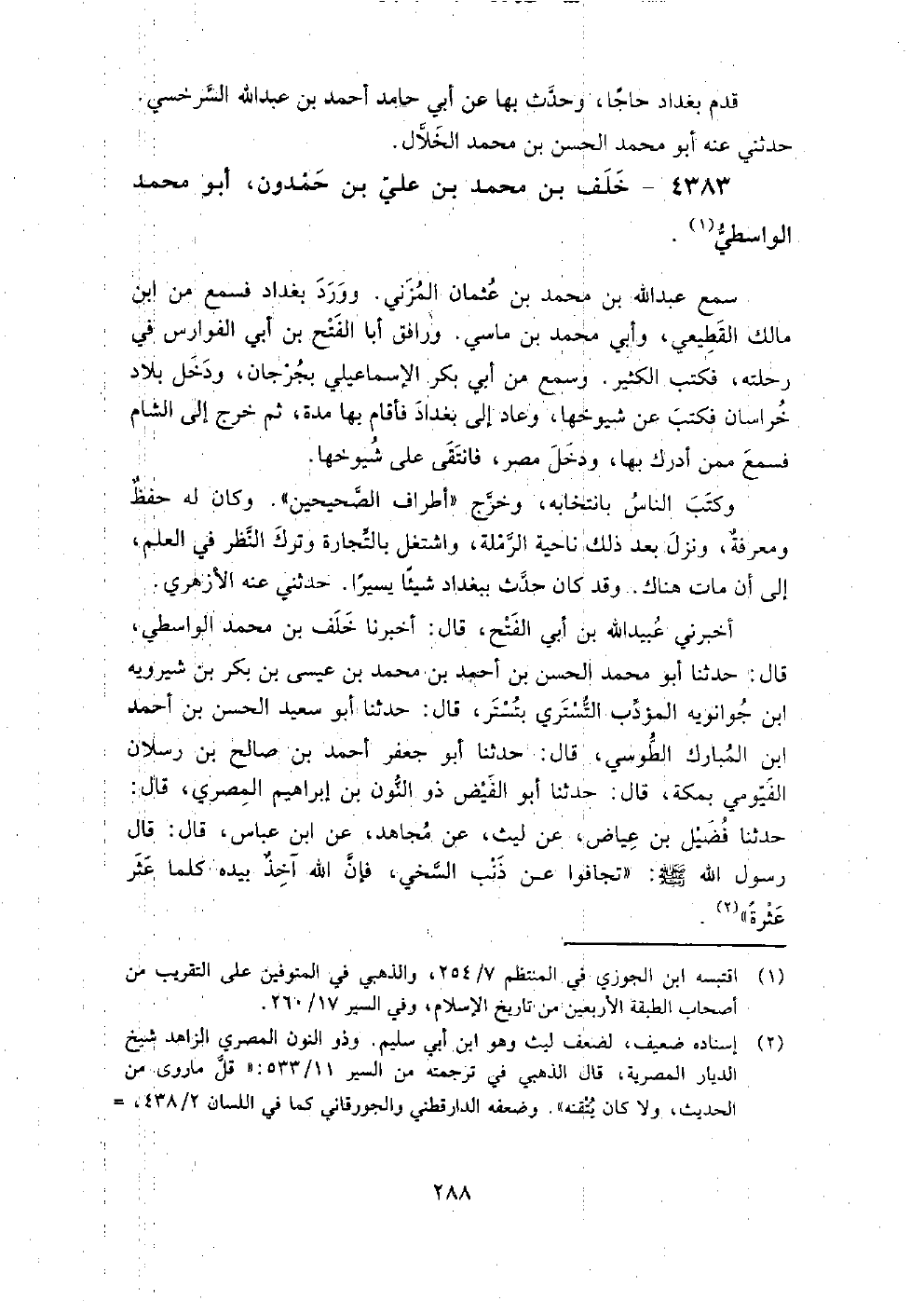 4383 - خلف بْن مُحَمَّد بْن عَلِيّ بْن حمدون أَبُو مُحَمَّد الواسطي سمع عَبْد اللَّهِ بْن مُحَمَّد بْن عُثْمَان المزني وَورد بَغْدَاد فسمع من ابْن مَالِك الْقَطِيعِيّ، وَأبي مُحَمَّد بْن ماسي.