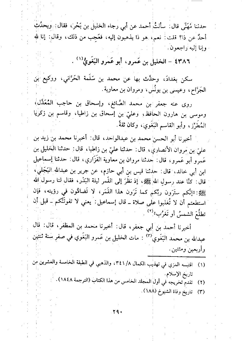 (2815) -[9: 290] أَخْبَرَنَا أَبُو الْحَسَنِ مُحَمَّدُ بْنُ عَبْدِ الْوَاحِدِ، قَالَ: أَخْبَرَنَا مُحَمَّدُ بْنُ زَيْدِ بْنِ عَلِيِّ بْنِ مَرْوَانَ الأَنْصَارِيُّ، قَالَ: حَدَّثَنَا عَلِيُّ بْنُ زَاطِيَا، قَالَ: حَدَّثَنَا الْخَلِيلُ بْنُ عَمْرٍو أَبُو عَمْرٍو، قَالَ: حَدَّثَنَا مَرْوَانُ بْنُ مِعَاوِيَةَ الْفَزَارِيُّ، قَالَ: حَدَّثَنَا إِسْمَاعِيلُ بْنُ أَبِي خَالِدٍ، قَالَ: حَدَّثَنَا قَيْسُ بْنُ أَبِي حَازِمٍ، عَنْ جَرِيرِ بْنِ عَبْدِ اللَّهِ الْبَجَلِيِّ، قَالَ: كُنَّا عِنْدَ رَسُولِ اللَّهِ صَلَّى اللَّهُ عَلَيْهِ وَسَلَّمَ إِذْ نَظَرَ إِلَى الْقَمَرِ لَيْلَةِ الْبَدْرِ، فَقَالَ لَنَا رَسُولُ اللَّهِ صَلَّى اللَّهُ عَلَيْهِ وَسَلَّمَ: " إِنَّكُمْ سَتَرَوْنَ رَبَّكُمْ كَمَا تَرَوْنَ هَذَا الْقَمَرَ، لا تُضَامُونَ فِي رُؤْيَتِهِ، فَإِنِ اسْتَطَعْتُمْ أَنْ لا تُغْلَبُوا عَلَى صَلاةٍ، قَالَ إِسْمَاعِيلُ: يَعْنِي لا تَفُوتَنَّكُمْ، قَبْلَ أَنْ تَطْلُعَ الشَّمْسُ أَوْ تَغْرُبَ " أَخْبَرَنَا أَحْمَد بْن أَبِي جَعْفَر، قَالَ: أَخْبَرَنَا مُحَمَّد بْن المظفر، قَالَ: قَالَ عَبْد اللَّهِ بْن مُحَمَّد البغوي: مات الخليل بْن عَمْرو البغوي فِي صفر سنة ثنتين وَأربعين وَمائتين.