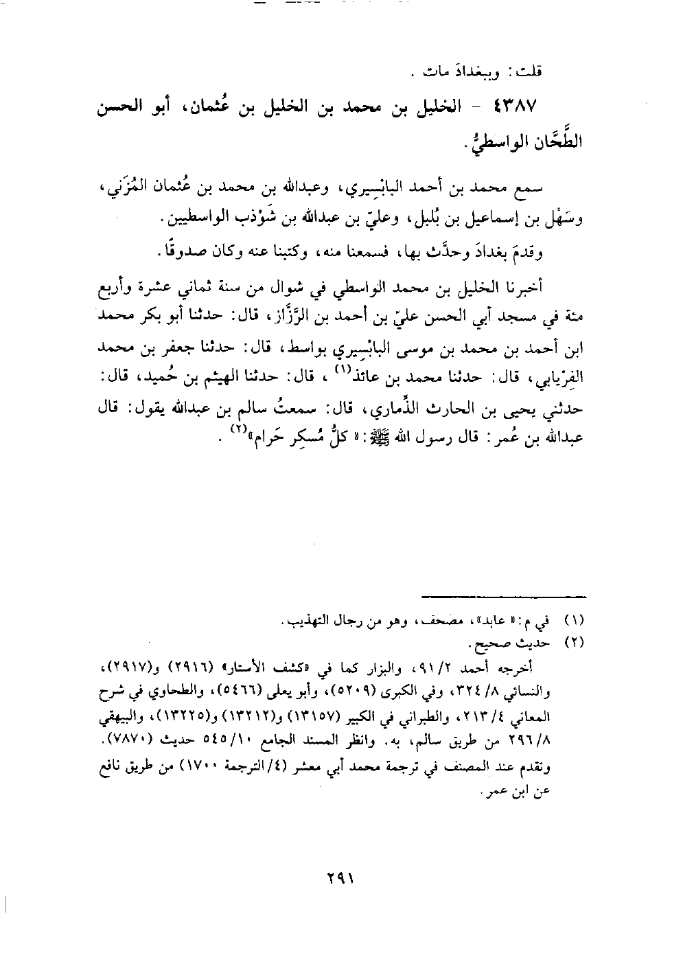 4387 - الخليل بْن مُحَمَّد بْن الخليل بْن عُثْمَان أَبُو الْحَسَن الطحان الواسطي سمع مُحَمَّد بْن أَحْمَد البابسيري، وَعبد اللَّه بْن مُحَمَّد بْن عُثْمَان المزني، وَسهل بْن إِسْمَاعِيل بْن بلبل، وَعلي بْن عَبْد اللَّهِ بْن شَوْذَب الواسطيين.