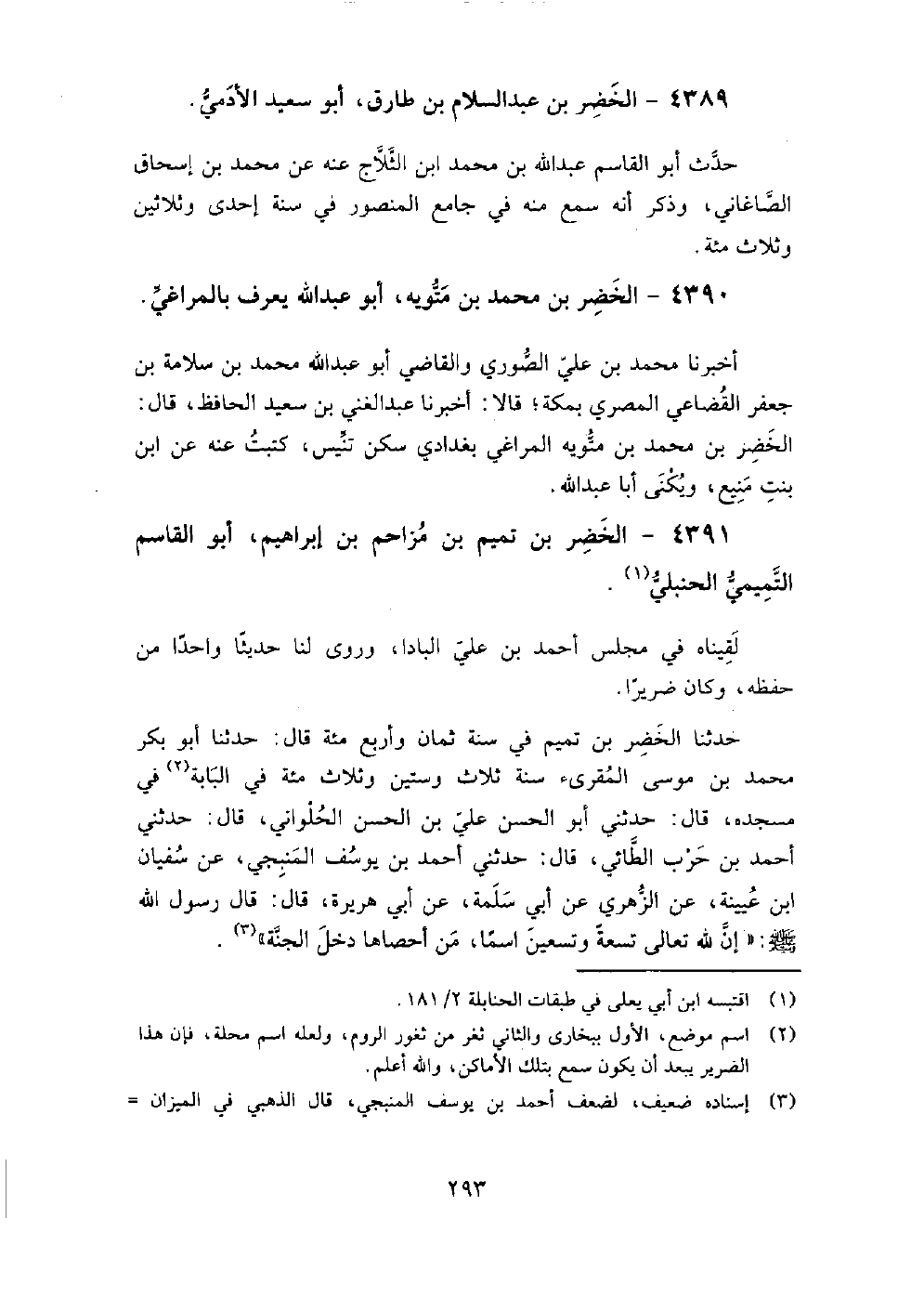 (2818) -[9: 293] حَدَّثَنَا الْخِضْرُ بْنُ تَمِيمٍ فِي سَنَةِ ثَمَانٍ وَأَرْبَعِ مِائَةٍ، قَالَ: حَدَّثَنَا أَبُو بَكْرٍ مُحَمَّدُ بْنُ مُوسَى الْمُقْرِئُ سَنَةَ ثَلاثٍ وَسِتِّينَ وَثَلاثِ مِائَةٍ فِي الْبَابَةِ فِي مَسْجِدِهِ، قَالَ: حَدَّثَنِي أَبُو الْحَسَنِ عَلِيُّ بْنُ الْحَسَنِ الْحَلْوَانِيُّ، قَالَ: حَدَّثَنِي أَحْمَدُ بْنُ حَرْبٍ الطَّائِيُّ، قَالَ: حَدَّثَنِي أَحْمَدُ بْنُ يُوسُفَ الْمَنْبِجِيُّ، عَنْ سُفْيَانَ بْنِ عُيَيْنَةَ، عَنِ الزُّهْرِيِّ، عَنْ أَبِي سَلَمَةَ، عَنْ أَبِي هُرَيْرَةَ، قَالَ: قَالَ رَسُولُ اللَّهِ صَلَّى اللَّهُ عَلَيْهِ وَسَلَّمَ: " إِنَّ لِلَّهِ تَعَالَى تِسْعَةٌ وَتِسْعِينَ اسْمًا مَنْ أَحْصَاهَا دَخَلَ الْجَنَّةَ "، كَذَا حَدَّثَنَاهُ بِهَذَا الإِسْنَادِ مات الخضر فِي ذي الحجة من سنة خمس عشرة وَأربع مائة، وَكنت إذ ذاك بنيسابور.