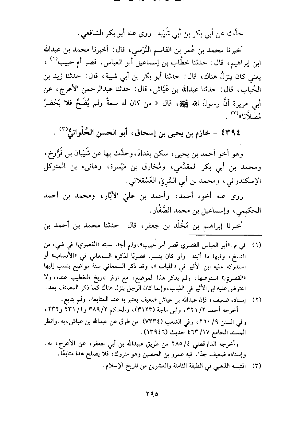 4394 - خازم بْن يَحْيَى بْن إسحاق أَبُو الْحَسَن الحلواني وهو أخو أَحْمَد بْن يَحْيَى، سكن بَغْدَاد، وَحدث بها عَنْ شيبان بْن فروخ، وَمحمد بْن أَبِي بَكْر المقدمي، وَمخارق بْن ميسرة، وَهانئ بْن المتوكل الإسكندراني، وَمحمد بْن أَبِي السري العسقلاني.