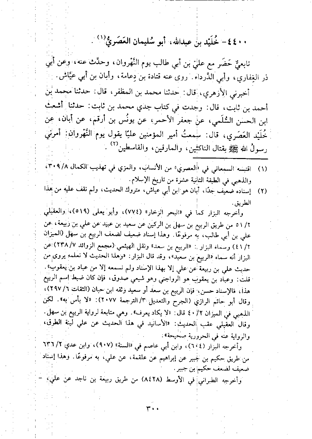 4400 - خليد بْن عَبْد اللَّهِ أَبُو سُلَيْمَان العصري تابعي حضر مَعَ عَلِيّ بْن أَبِي طَالِبٍ يوم النهروان، وَحدث عنه، وَعن أَبِي ذر الغفاري، وَأبي الدرداء.