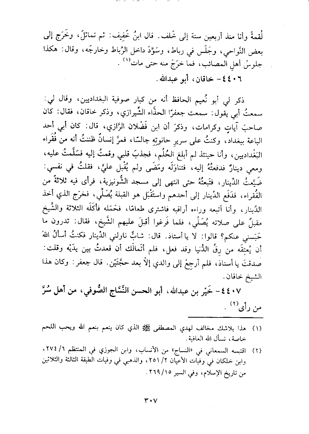 4407 - خير بْن عَبْد اللَّهِ أَبُو الْحَسَن النساج الصوفي من أَهْل سر من رأى نزل بَغْدَاد، وَكَانَ له حلقة يتكلم فيها، وَكَانَ قد صحب أبا حمزة مُحَمَّد بْن إِبْرَاهِيمَ الصوفي وَغيره، وَصحبه الجنيد بْن مُحَمَّد، وَأبو الْعَبَّاس بْن عطاء، وَأبو مُحَمَّد الجريري، وَأبو بَكْر الشبلي، وَعمر عمرا طويلا حَتَّى لقيه أَحْمَد بْن عطاء الروذباري.