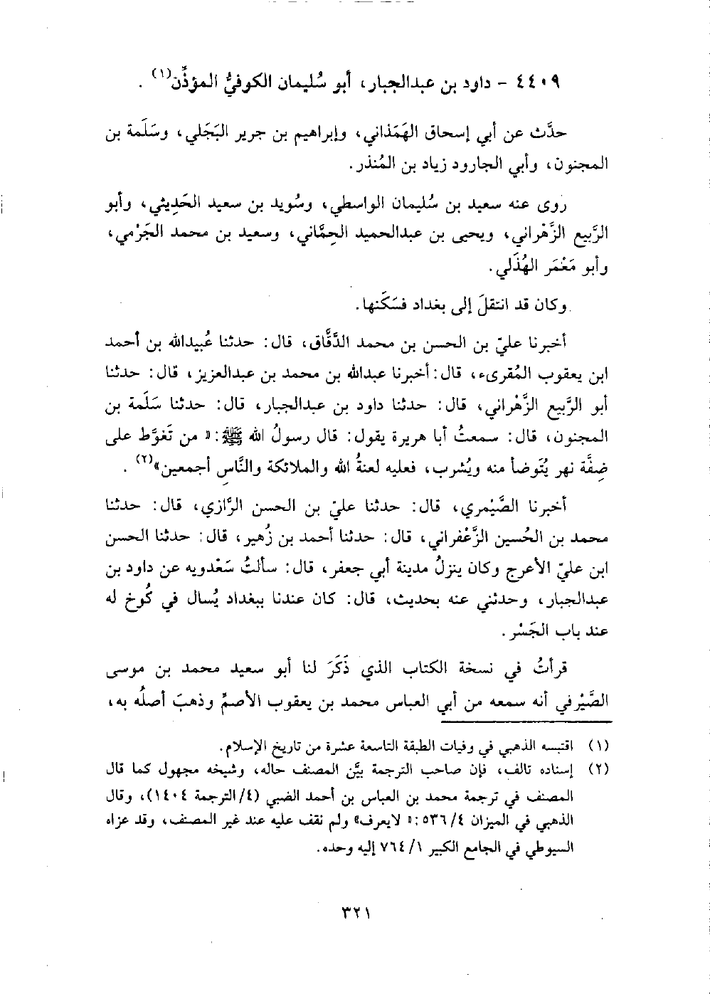 4409 - داود بْن عَبْد الجبار أَبُو سُلَيْمَان الكوفي المؤذن حدث عَنْ أَبِي إسحاق الهمذاني، وَإِبْرَاهِيم بْن جرير البجلي، وسلمة بن المجنون، وأبي الجارود زياد بن المنذر.