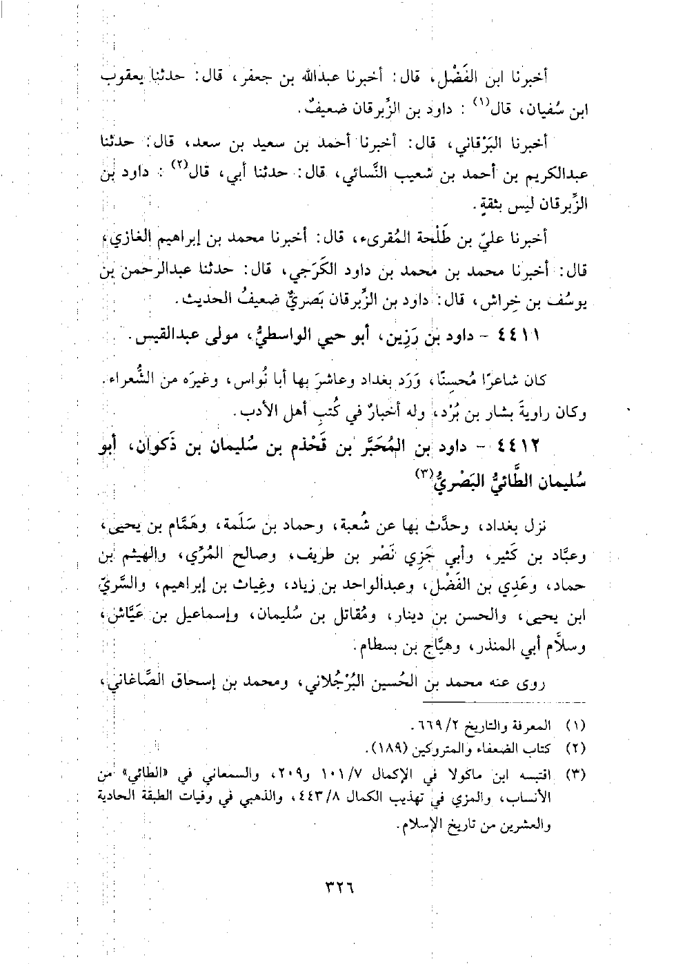 4412 - داود بْن المحبر بْن قحذم بْن سُلَيْمَان بْن ذكوان أَبُو سُلَيْمَان الطائي البصري نزل بَغْدَاد، وَحدث بها عَنْ شعبة، وَحماد بْن سلمة، وَهمام بْن يَحْيَى، وَعباد بْن كثير، وَأبي جزي نصر بْن طريف، وَصالح المري، وَالهيثم بْن حَمَّاد، وَعدي بْن الفضل، وَعبد الواحد بْن زِيَاد، وَغياث بْن إِبْرَاهِيمَ، وَالسري بْن يَحْيَى، وَالحسن بْن دينار، وَمقاتل بْن سُلَيْمَان، وَإسماعيل بْن عَيَّاشٍ، وَسلام أَبِي المنذر، وَهياج بْن بسطام.