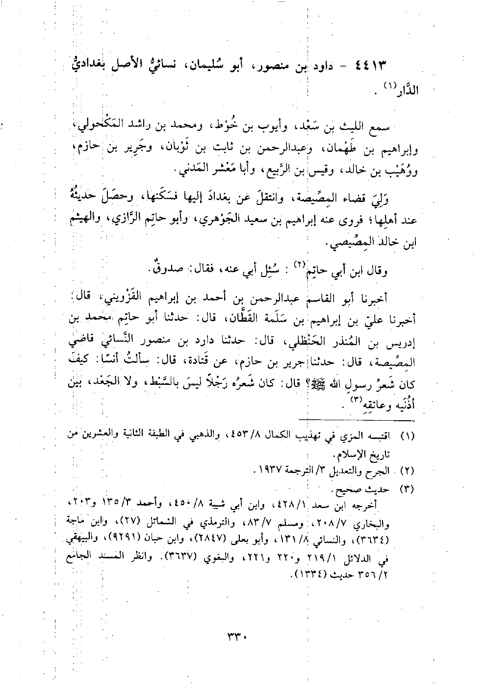 4413 - داود بْن منصور أَبُو سُلَيْمَان نسائي الأصل بغدادي الدار سمع الليث بْن سَعْد، وَأيوب بْن خوط، وَمحمد بْن راشد المكحولي، وَإِبْرَاهِيم بْن طهمان، وَعبد الرحمن بْن ثابت بْن ثوبان، وَجرير بْن حازم، وَوهيب بْن خَالِد، وَقيس بْن الربيع، وَأبا معشر المدني.