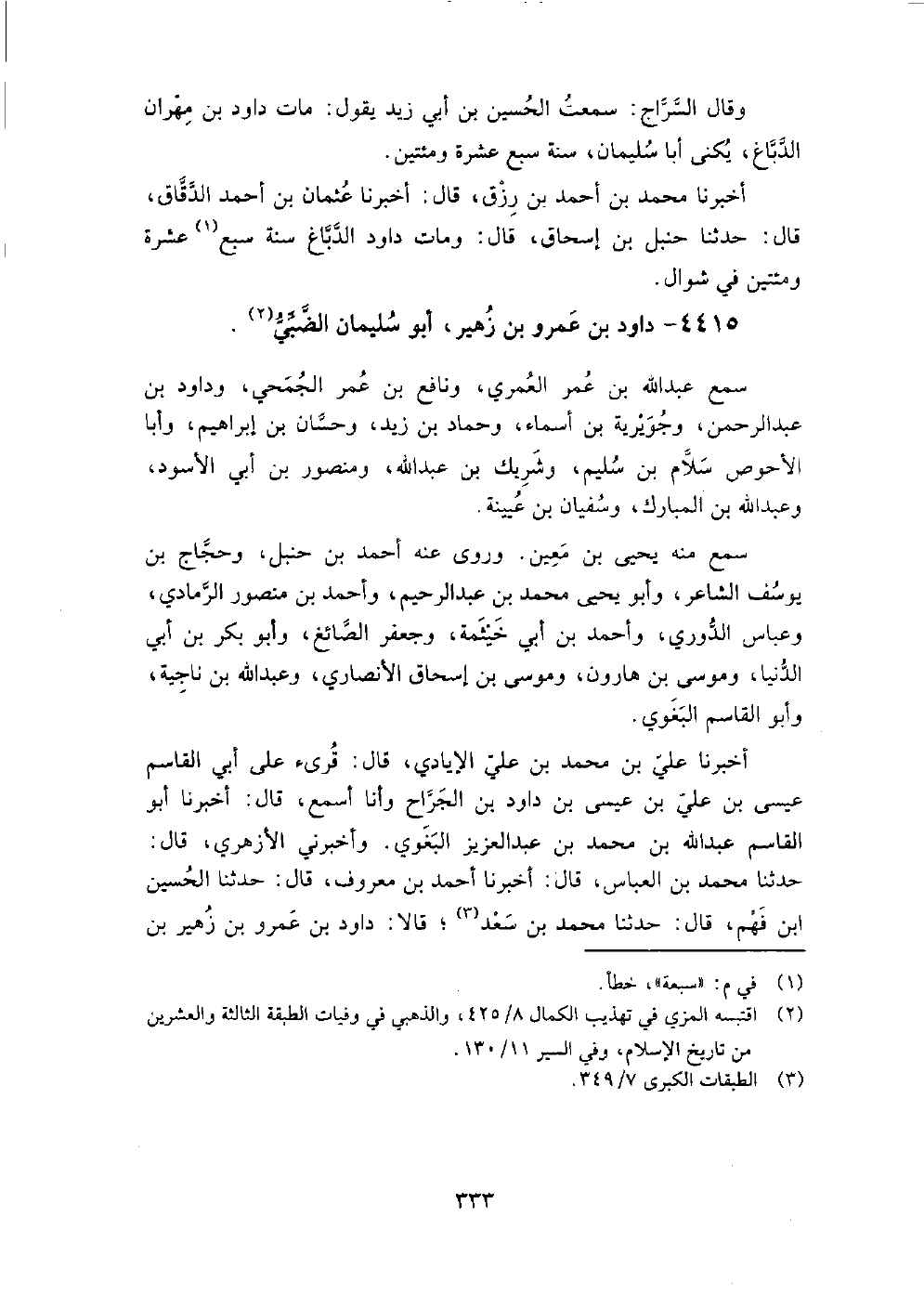 4415 - داود بْن عَمْرو زهير أَبُو سُلَيْمَان الضبي سمع عَبْد اللَّهِ بْن عُمَر العمري، وَنافع بْن عُمَر الجمحي، وَداود بْن عَبْد الرَّحْمَنِ، وَجويرية بْن أسماء، وَحماد بْن زيد، وَحسان بْن إِبْرَاهِيمَ، وَأبا الأحوص سلام بْن سليم، وَشريك بْن عَبْد اللَّهِ، وَمنصور بْن أَبِي الأسود، وَعبد اللَّه بْن المبارك، وَسفيان بْن عيينة.