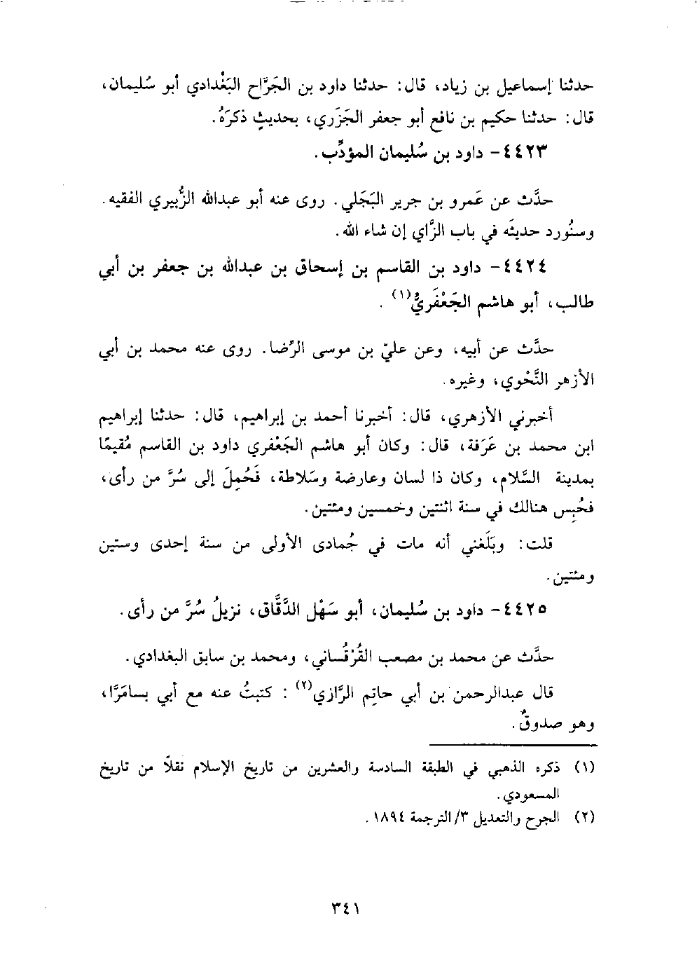 4425 - دَاوُد بْن سُلَيْمَان أَبُو سهل الدَّقَّاق نزيل سر من رأى حدث عَنْ: مُحَمَّد بْن مصعب القرقساني، وَمحمد بْن سابق البغدادي.
