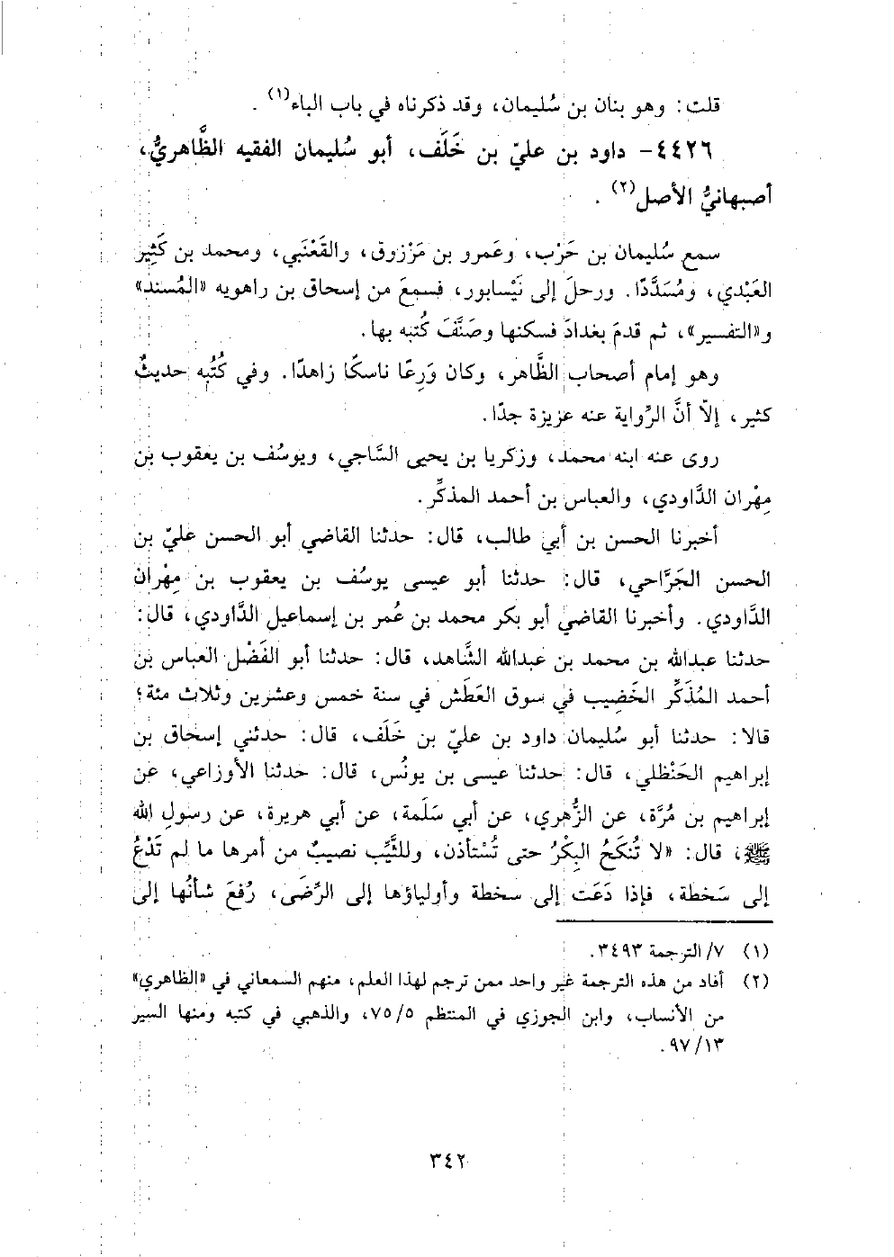 4426 - دَاوُد بْن عَلِيّ بْن خلف أَبُو سُلَيْمَان الفقيه الظاهري أصبهاني الأصل سمع: سُلَيْمَان بْن حرب، وَعمرو بْن مرزوق، وَالقعنبي، وَمحمد بْن كثير العبدي، وَمسددا وَرحل إِلَى نيسابور، فسمع من إسحاق بْن راهويه المسند وَالتفسير، ثُمَّ قدم بَغْدَاد فسكنها وَصنف كتبه بها.