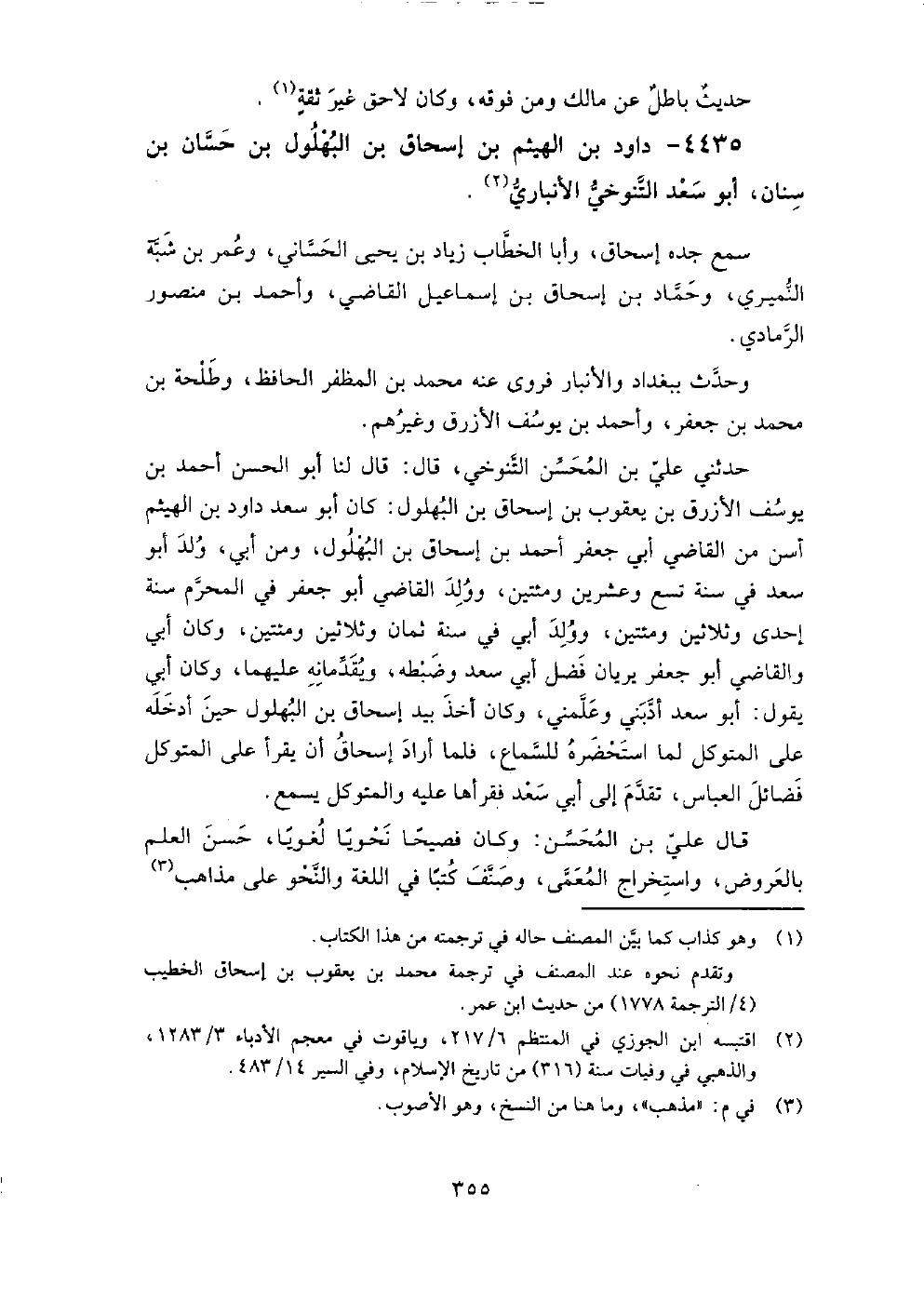 4435 - دَاوُد بْن الهيثم بْن إسحاق بْن البهلول بْن حسان بْن سنان أَبُو سَعْد التنوخي الأَنْبَارِيّ سمع: جده إسحاق، وَأبا الخطاب زِيَاد بْن يَحْيَى الحساني، وَعمر بْن شبة النميري، وَحماد بْن إسحاق بْن إِسْمَاعِيل الْقَاضِي، وَأحمد بْن منصور الرمادي.