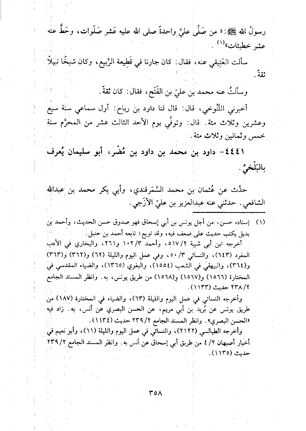 4441 - دَاوُد بْن مُحَمَّد بْن دَاوُد بْن مضر أَبُو سُلَيْمَان يعرف بالبلخي حدث عَنْ عُثْمَان بْن مُحَمَّد السَّمَرْقَنْدِيّ، وَأبي بَكْر مُحَمَّد بْن عَبْد اللَّهِ الشَّافِعِيّ.