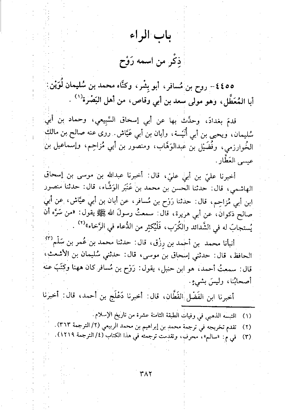 4455 - روح بْن مسافر أَبُو بشر وَكناه مُحَمَّد بْن سُلَيْمَان لوين أبا المعطل وَهُوَ مولى سَعْد بْن أَبِي وَقاص من أَهْل الْبَصْرَة قدم بَغْدَاد، وَحدث بها عَنْ أَبِي إسحاق السبيعي، وَحماد بْن أَبِي سُلَيْمَان، وَيحيى بْن أَبِي أنيسة، وَأبان بْن أَبِي عَيَّاشٍ.