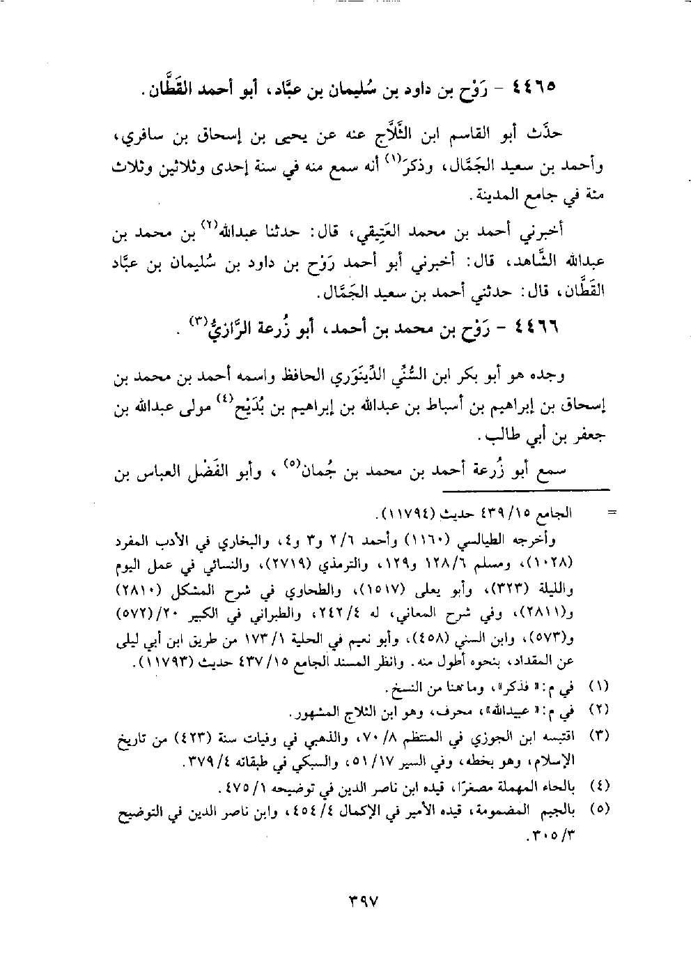 4465 - روح بْن دَاوُد بْن سُلَيْمَان بْن عباد أَبُو أَحْمَد الْقَطَّان حدث أَبُو الْقَاسِم ابن الثلاج عنه عَنْ يَحْيَى بْن إسحاق بْن سافري، وَأحمد بْن سَعِيد الجمال، وذكر أنه سمع منه فِي سنة إحدى وَثلاثين وَثلاث مائة فِي جامع الْمَدِينَة.