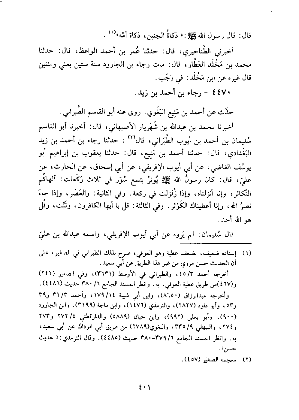 (2870) -[9: 401] أَخْبَرَنَا مُحَمَّدُ بْنُ عَبْدِ اللَّهِ بْنِ شَهْرِيَارَ الأَصْبَهَانِيُّ، قَالَ: أَخْبَرَنَا أَبُو الْقَاسِمِ سُلَيْمَانُ بْنُ أَحْمَدَ بْنِ أَيُّوبَ الطَّبَرَانِيُّ، قَالَ: حَدَّثَنَا رَجَاءُ بْنُ أَحْمَدَ بْنِ زَيْدٍ الْبَغْدَادِيُّ، قَالَ: حَدَّثَنَا أَحْمَدُ بْنُ مَنِيعٍ، قَالَ: حَدَّثَنَا يَعْقُوبُ بْنُ إِبْرَاهِيمَ أَبُو يُوسُفَ الْقَاضِي، عَنْ أَبِي أَيُّوبَ الإِفْرِيقِيُّ، عَنْ أَبِي إِسْحَاقَ، عَنِ الْحَارِثِ، عَنْ عَلِيٍّ، قَالَ: كَانَ رَسُولُ اللَّهِ صَلَّى اللَّهُ عَلَيْهِ وَسَلَّمَ " يُوتِرُ بِتِسْعِ سُوَرٍ فِي ثَلاثِ رَكَعَاتِ: أَلْهَاكُمُ التَّكَاثُرُ، وَإِنَّا أَنْزَلْنَاهُ، وَإِذَا زُلْزِلَتْ فِي رَكْعَةٍ، وَفِي الثَّانِيَةِ: وَالْعَصْرِ، وَإِذَا جَاءَ نَصْرُ اللَّهِ، وَإِنَّا أَعْطَيْنَاكَ الْكَوْثَرَ، وَفِي الثَّالِثَةِ: قُلْ يَا أَيُّهَا الْكَافِرُونَ، وَتَبَّتْ، وَقُلْ هُوَ اللَّهُ أَحَدٌ "، قَالَ سُلَيْمَانُ: لَمْ يَرْوِهِ عَنْ أَبِي أَيُّوبَ الإِفْرِيقِيِّ، وَاسْمُهُ عَبْدُ اللَّهِ بْنُ عَلِيٍّ إِلا أَبُو يُوسُفَ الْقَاضِي، تَفَرَّدَ بِهِ أَحْمَدُ بْنُ مَنِيعٍ