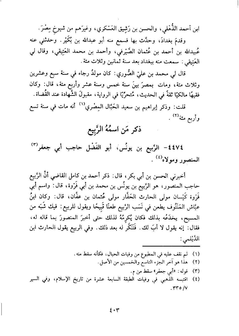 4474 - الربيع بْن يونس أَبُو الفضل حاجب أبي جعفر المنصور وَمولاه أَخْبَرَنِي الْحَسَن بْن أَبِي بَكْر، قَالَ: ذكر أَحْمَد بْن كامل الْقَاضِي أن الربيع حاجب المنصور، هو الربيع بْن يونس بْن مُحَمَّد بْن أَبِي فروة، قَالَ: وَاسم أَبِي فروة كيسان مولى الحارث الحفار مولى عُثْمَان بْن عفان، قَالَ: وَكَانَ ابْن عَيَّاشٍ المنتوف يطعن فِي نسب الربيع طعنا قبيحا، وَيقول للربيع: فيك شبه من المسيح، يخدعه بذلك فكان يكرمه لذلك حَتَّى أخبر المنصور بما قاله له، فَقَالَ: إنه يقول لا أب لك.