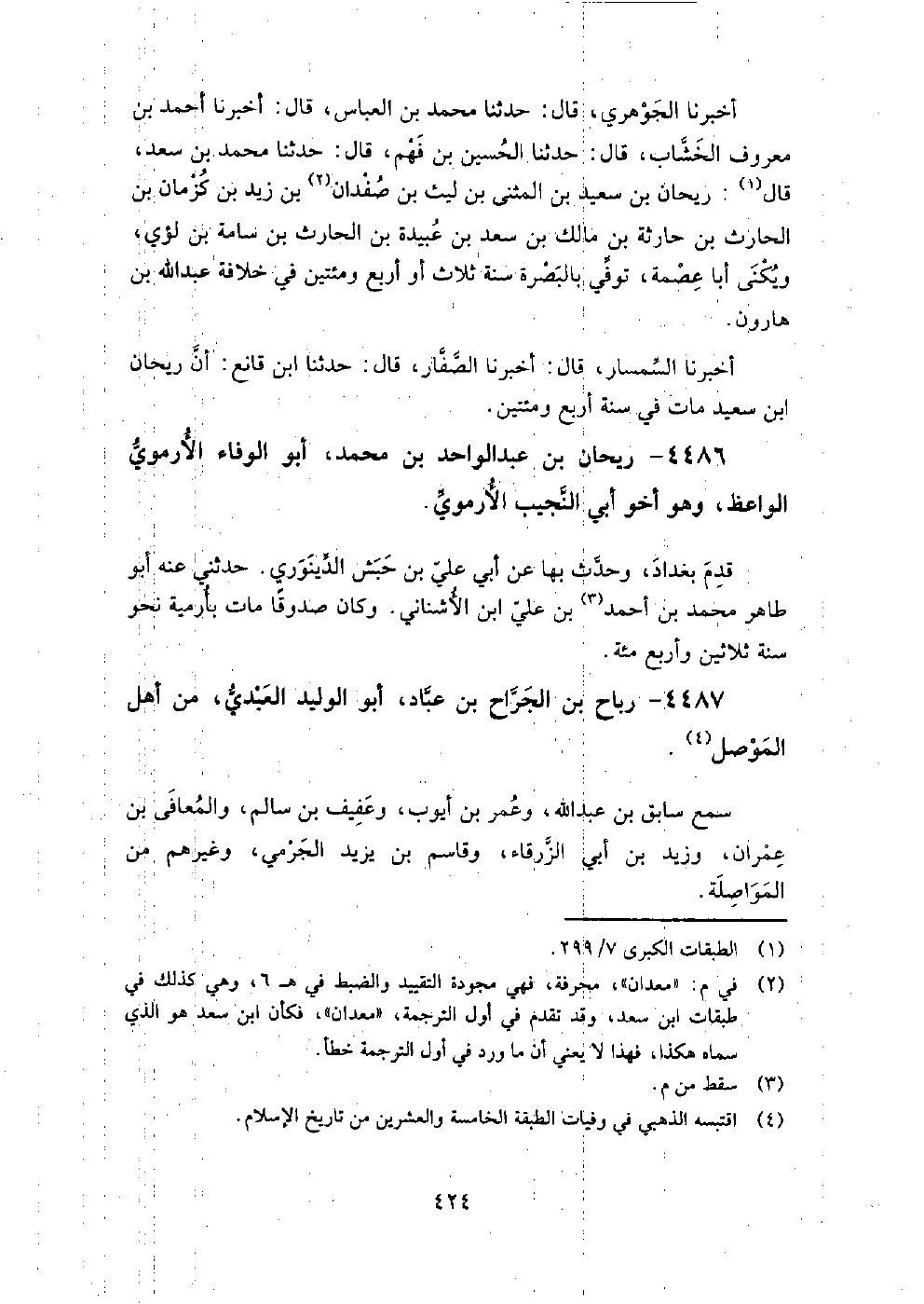 4487 - رباح بْن الجراح بْن عباد أَبُو الوليد العبدي من أَهْل الموصل سمع سابق بْن عَبْد اللَّهِ وَعمر بْن أَيُّوب، وَعفيف بْن سالم، وَالمعافى بْن عمران، وَزيد بْن أَبِي الزرقاء، وَقاسم بْن يَزِيد الجرمي، وَغيرهم من المواصلة.