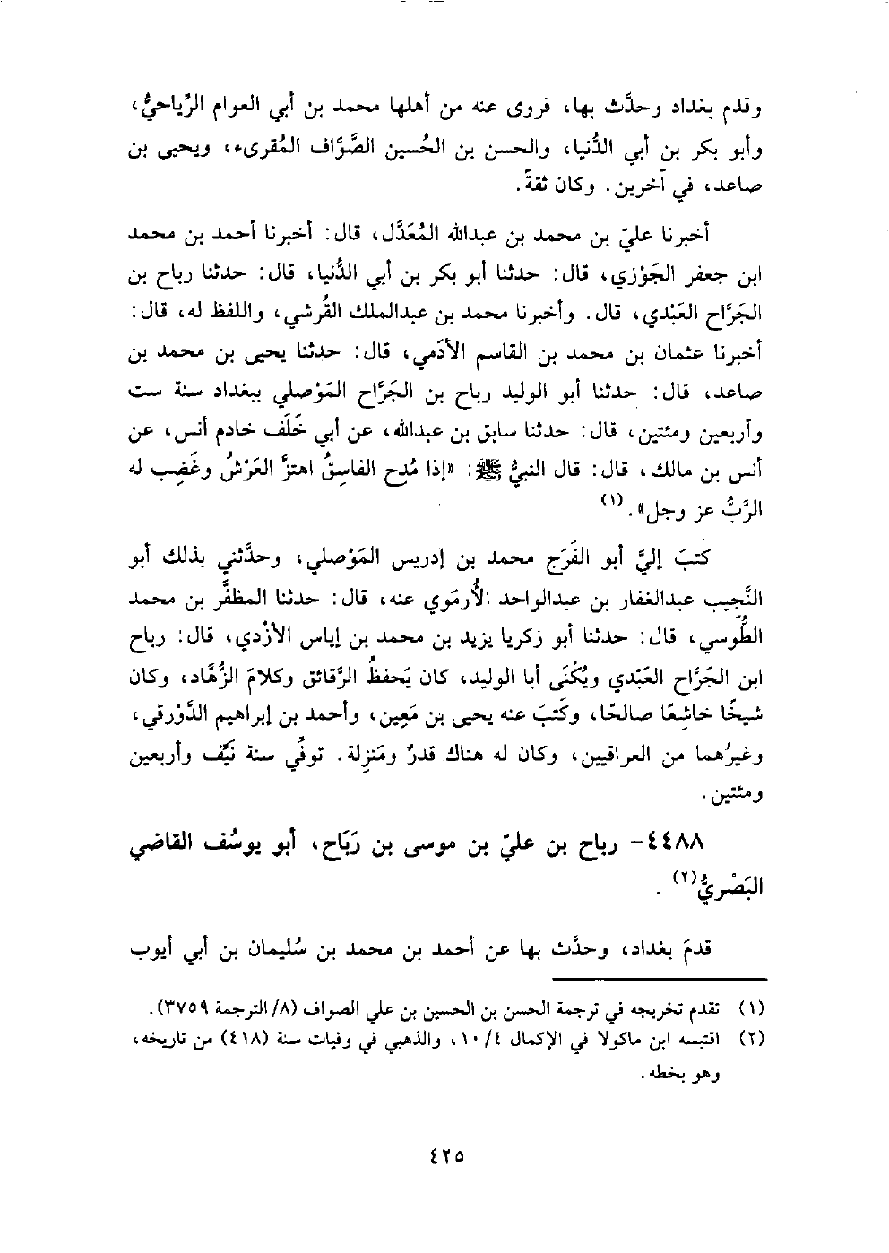 4488 - رباح بْن عَلِيّ بْن مُوسَى بْن رباح أَبُو يوسف الْقَاضِي البصري قدم بَغْدَاد، وَحدث بها عَنْ أَحْمَد بْن مُحَمَّد بْن سُلَيْمَان بْن أَيُّوب المالكي، وَأحمد بْن الْحُسَيْن المعروف بشعبة، وَأبي إسحاق الهجيمي، وَمحمد بْن مُحَمَّد بْن بَكْر الهزاني البصريين.