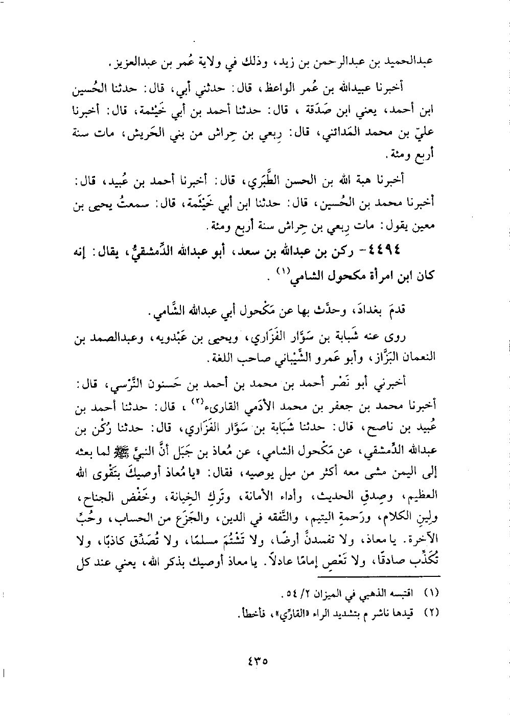 (2886) -[9: 435] أَخْبَرَنِي أَبُو نَصْرٍ أَحْمَدُ بْنُ مُحَمَّدِ بْنِ أَحْمَدَ بْنِ حَسْنُونَ النَّرْسِيُّ، قَالَ: أَخْبَرَنَا مُحَمَّدُ بْنُ جَعْفَرِ بْنِ مُحَمَّدٍ الآدَمِيُّ الْقَارِئُ، قَالَ: حَدَّثَنَا أَحْمَدُ بْنُ عُبَيْدِ بْنِ نَاصِحٍ، قَالَ: حَدَّثَنَا شَبَابَةُ بْنُ سَوَّارٍ الْفَزَارِيُّ، قَالَ: حَدَّثَنَا رُكْنُ بْنُ عَبْدِ اللَّهِ الدِّمَشْقِيُّ، عَنْ مَكْحُولٍ الشَّامِيِّ، عَنْ مُعَاذِ بْنِ جَبَلٍ، أَنَّ النَّبِيَّ صَلَّى اللَّهُ عَلَيْهِ وَسَلَّمَ لَمَّا بَعَثَهُ إِلَى الْيَمَنِ مَشَى مَعَهُ أَكْثَرُ مِنْ مِيلٍ يُوصِيهِ، فَقَالَ: يَا مُعَاذُ، " أُوصِيكَ بِتَقْوَى اللَّهِ الْعَظِيمِ، وَصِدْقِ الْحَدِيثِ، وَأَدَاءِ الأَمَانَةِ، وَتَرْكِ الْخِيَانَةِ، وَخَفْضِ الْجَنَاحِ، وَلِينِ الْكَلامِ، وَرَحْمَةِ الْيَتِيمِ، وَالتَّفَقُّهِ فِي الدِّينِ، وَالْجَزَعِ مِنَ الْحِسَابِ، وَحُبِّ الآخِرَةِ.