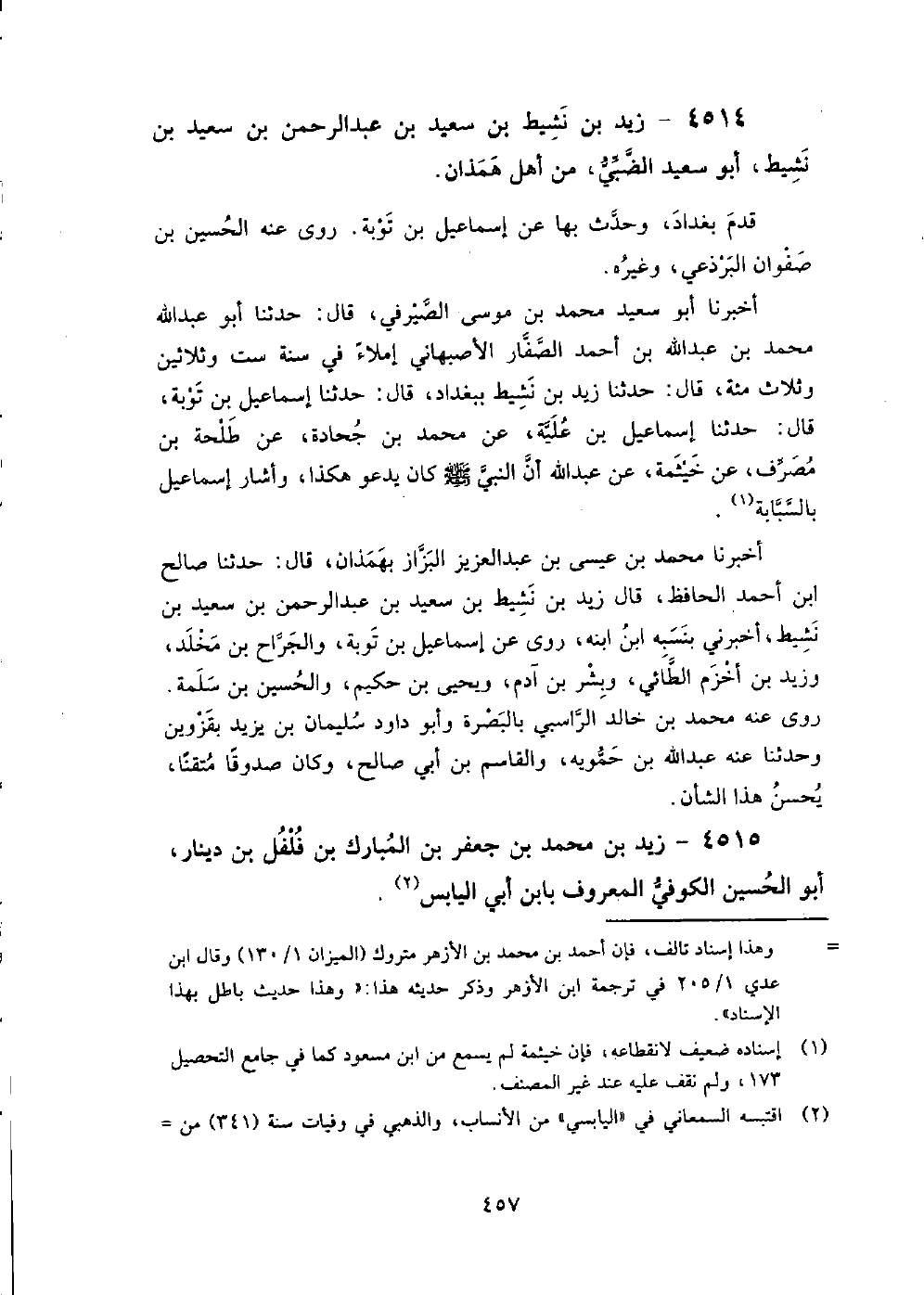 4514 - زيد بْن نشيط بْن سَعِيد بْن عَبْد الرَّحْمَنِ بْن سَعِيد بْن نشيط أَبُو سَعِيد الضبي من أَهْل همذان قدم بَغْدَاد، وَحدث بها عَنْ إِسْمَاعِيل بْن توبة.