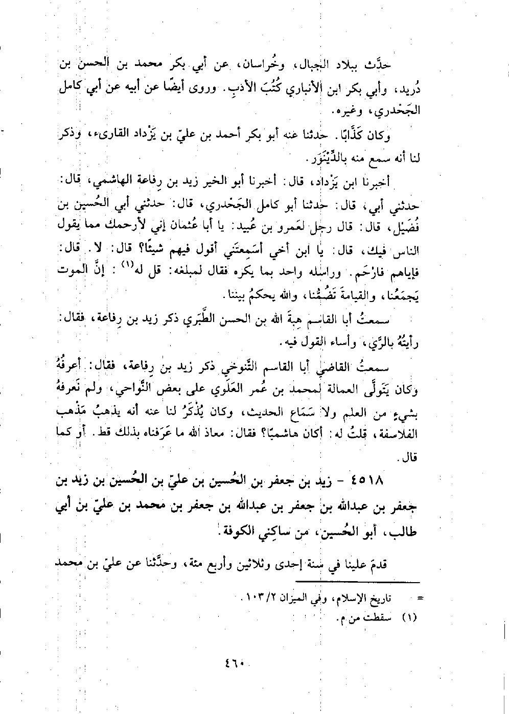4518 - زيد بْن جَعْفَر بْن الْحُسَيْن بْن عَلِيّ بْن الْحُسَيْن بْن زيد بْن جَعْفَر بْن عَبْد اللَّهِ بْن جَعْفَر بْن عَبْد اللَّهِ بْن جَعْفَر بْن مُحَمَّد بْن عَلِيّ بْن أَبِي طَالِبٍ أَبُو الْحُسَيْن من ساكني الكوفة قدم علينا فِي سنة إحدى وَثلاثين وَأربع مائة، وَحَدَّثَنَا عَنْ عَلِيِّ بْن مُحَمَّد ابْن مُوسَى التمار البصري، وَمحمد بْن جَعْفَر بْن النجار الكوفي، وَكَانَ صدوقا.