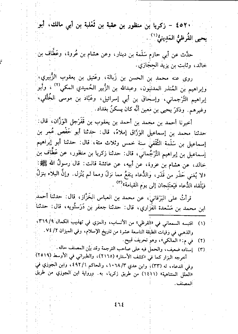 4520 - زَكَرِيَّا بْن منظور بْن عقبة بْن ثعلبة بْن أَبِي مَالِك أَبُو يَحْيَى القرظي المديني حدث عَنْ أَبِي حازم سلمة بْن دينار، وَعن هِشَام بْن عروة، وَعطاف بْن خَالِد، وَثابت بْن يَزِيد الحجازي.