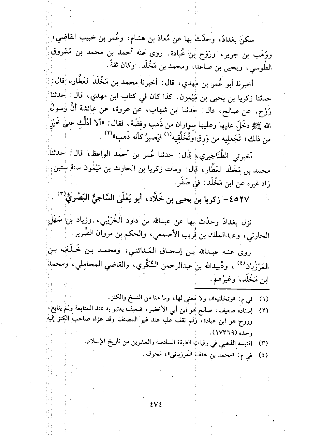 4527 - زَكَرِيَّا بْن يَحْيَى بْن خلاد أَبُو يعلى الساجي البصري نزل بَغْدَاد وَحدث به عَنْ عَبْد اللَّهِ بْن دَاوُد الخريبي، وَزياد بْن سهل الحارثي، وَعبد الملك بْن قريب الأصمعي، وَالحكم بْن مَرْوَان الضرير.