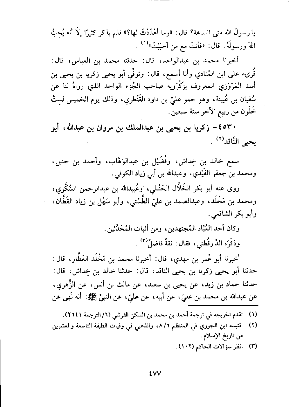 4530 - زَكَرِيَّا بْن يَحْيَى بْن عَبْد الملك بْن مَرْوَان بْن عَبْد اللَّهِ أَبُو يَحْيَى الناقد سمع: خَالِد بْن خداش، وَفضيل بْن عَبْد الوهاب، وَأحمد بْن حَنْبَل، وَمحمد بْن جَعْفَر الفيدي، وَعبد اللَّه بْن أَبِي زِيَاد الكوفي.
