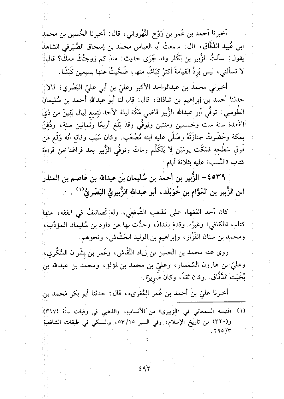 4539 - الزبير بْن أَحْمَد بْن سُلَيْمَان بْن عَبْد اللَّهِ بْن عاصم بْن المنذر بْن الزبير بْن العوام بْن خويلد أَبُو عَبْد اللَّهِ الزبيري البصري كَانَ أحد الفقهاء على مذهب الشَّافِعِيّ، وَله تصانيف فِي الفقه، منها كتاب الكافي وَغيره وَقدم بَغْدَاد، وَحدث بها عَنْ دَاوُد بْن سُلَيْمَان المؤدب، وَمحمد بْن سنان القزاز، وَإِبْرَاهِيم بْن الوليد الجشاش، وَنحوهم.