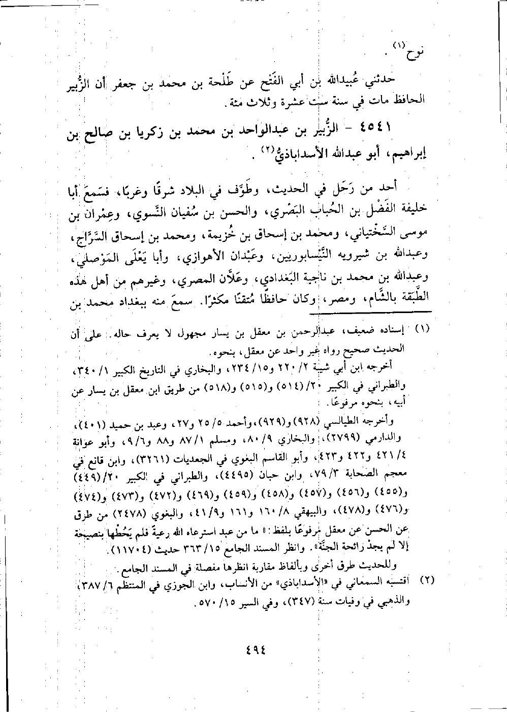 4541 - الزبير بْن عَبْد الواحد بْن مُحَمَّد بْن زَكَرِيَّا بْن صالح بْن إِبْرَاهِيمَ أَبُو عَبْد اللَّهِ الأسداباذي أحد من رحل فِي الحديث، وَطوف فِي البلاد شرقا وَغربا، فسمع أبا خليفة الفضل بْن الحباب البصري، وَالحسن بْن سفيان النسوي، وَعمران بْن مُوسَى السَّخْتِيَانِيّ، وَمحمد بْن إسحاق بْن خزيمة، وَمحمد بْن إسحاق السراج، وَعبد اللَّه بْن شيرويه النيسابوريين، وَعبدان الأهوازي، وَأبا يعلى الموصلي، وَعبد اللَّه بْن مُحَمَّد بْن ناجية البغدادي، وَعلان المصري، وَغيرهم من أَهْل هذه الطبقة بالشام، وَمصر، وَكَانَ حافظا متقنا مكثرا.