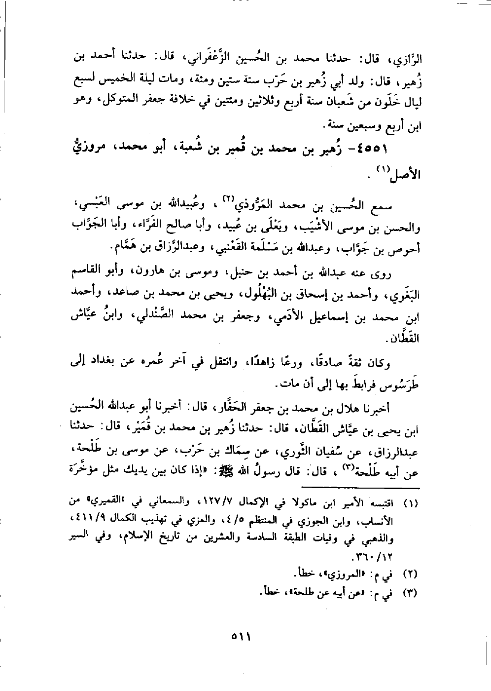 4551 - زهير بْن مُحَمَّد بْن قمير بْن شعبة أَبُو مُحَمَّد مروزي الأصل سمع الْحُسَيْن بْن مُحَمَّد الْمروذيّ، وَعبيد اللَّه بْن مُوسَى العبسي، وَالحسن بْن مُوسَى الأشيب، وَيعلى بْن عُبَيْد، وَأبا صالح الفراء، وَأبا الجواب أحوص بْن جواب، وَعبد اللَّه بْن مسلمة القعنبي، وَعبد الرزاق بْن همام.