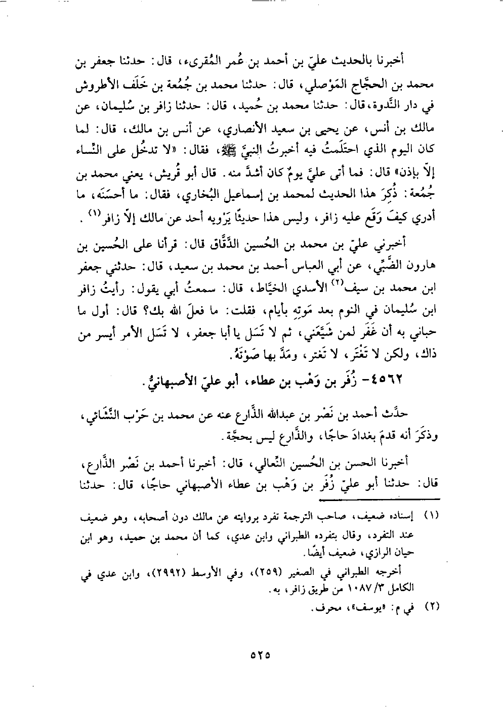 4562 - زفر بْن وَهب بْن عطاء أَبُو علي الأَصْبَهَانِيّ حدث أَحْمَد بْن نصر بْن عَبْد اللَّهِ الذارع عنه عَنْ مُحَمَّد بْن حرب النشائي، وَذكر أنه قدم بَغْدَاد حاجا، وَالذارع ليس بحجة.