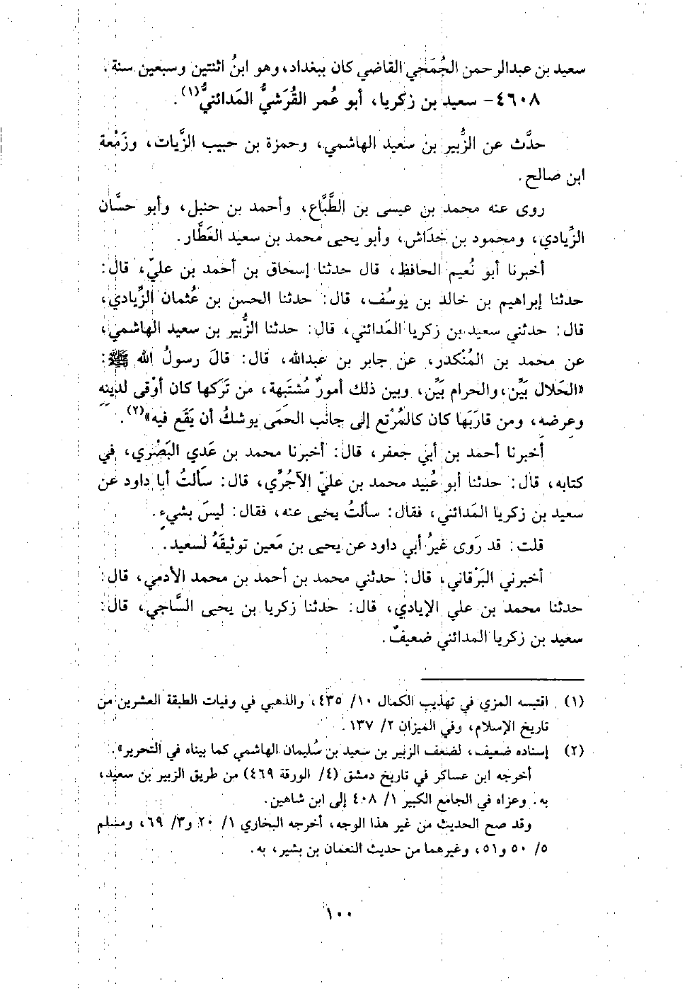 (2970) -[10: 100] أَخْبَرَنَا أَبُو نُعَيْمٍ الْحَافِظُ، قَالَ: حَدَّثَنَا إِسْحَاقُ بْنُ أَحْمَدَ بْنِ عَلِيٍّ، قَالَ: حَدَّثَنَا إِبْرَاهِيمُ بْنُ خَالِدِ بْنِ يُوسُفَ، قَالَ: حَدَّثَنَا الْحَسَنُ بْنُ عُثْمَانَ الزِّيَادِيُّ، قَالَ: حَدَّثَنِي سَعِيدُ بْنُ زَكَرِيَّا الْمَدَائِنِيُّ، قَالَ: حَدَّثَنَا الزُّبَيْرُ بْنُ سَعِيدٍ الْهَاشِمِيُّ، عَنْ مُحَمَّدِ بْنِ الْمُنْكَدِرِ، عَنْ جَابِرِ بْنِ عَبْدِ اللَّهِ، قَالَ: قَالَ رَسُولُ اللَّهِ صَلَّى اللَّهُ عَلَيْهِ وَسَلَّمَ: " الْحَلالُ بَيِّنٌ وَالْحَرَامُ بَيِّنٌ، وَبَيْنَ ذَلِكَ أُمُورٌ مُشْتَبِهَةٌ، مَنْ تَرَكَهَا كَانَ أَوْقَى لِدِينِهِ وَعِرْضِهِ، وَمَنْ قَارَبَهَا كَانَ كَالْمُرْتِعِ إِلَى جَانِبِ الْحِمَى يُوشِكُ أَنْ يَقَعَ فِيهِ " أَخْبَرَنَا أحمد بن أبي جعفر، قال: أَخْبَرَنَا محمد بن عدي البصري، في كتابه، قال: حَدَّثَنَا أبو عبيد محمد بن علي الآجري، قال: سألت أبا داود عن سعيد بن زكريا المدائني، فقال: سألت يحيى عنه، فقال: ليس بشيء.