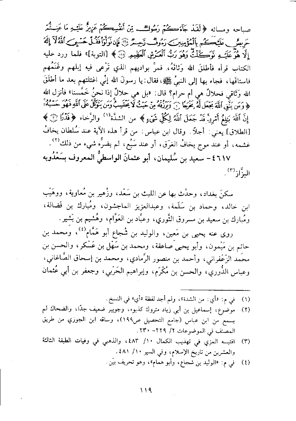 أَخْبَرَنَا محمد بن عبد الواحد الأكبر، قال: أَخْبَرَنَا الوليد بن بكر، قال: حَدَّثَنَا علي بن أحمد بن زكريا الهاشمي، قال: حَدَّثَنَا أبو مسلم صالح بن أحمد العجلي، قال: حَدَّثَنِي أبي، قال: سعيد بن سليمان، ويعرف بسعدويه واسطي ثقة، قيل له بعد ما انصرف من المحنة: ما فعلتم؟ قال: كفرنا ورجعنا.