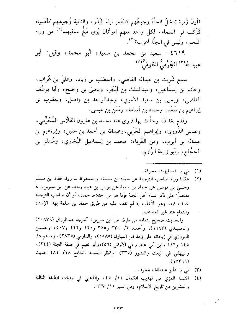 4619 - سعيد بن محمد بن سعيد أبو محمد وقيل أبو عبيد الله الجرمي الكوفي سمع شريك بن عبد الله القاضي، والمطلب بن زياد، وعلي بن غراب، وحاتم بن إسماعيل، وعبد الملك بن أبجر، ويحيى بن واضح، وأبا يوسف القاضي، ويحيى بن سعيد الأموي، وعبد الواحد بن واصل، ويعقوب بن إبراهيم بن سعد، وحماد بن أسامة، ومعن بن عيسى.