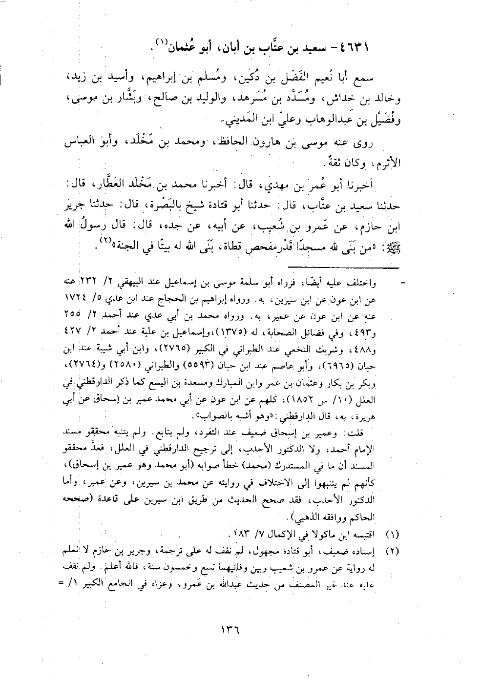 4631 - سعيد بن عتاب بن أبان أبو عثمان سمع أبا نعيم الفضل بن دكين، ومسلم بن إبراهيم، وأسيد بن زيد، وخالد بن خداش، ومسدد بن مسرهد، والوليد بن صالح، وبشار بن موسى، وفضيل بن عبد الوهاب، وعلي ابن المديني.