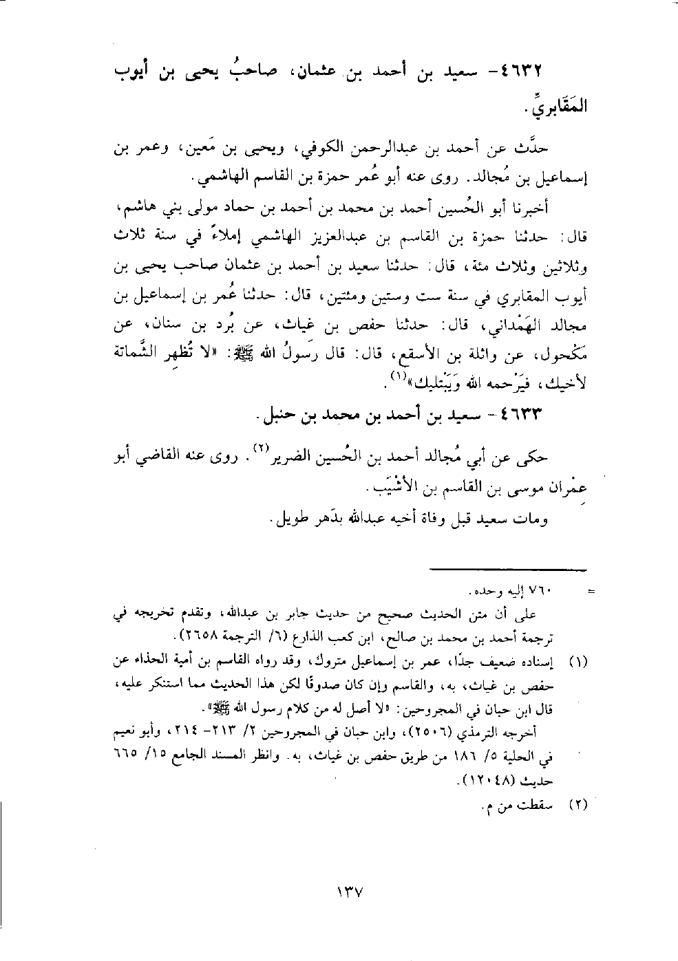 4633 - سعيد بن أحمد بن محمد بن حنبل حكى عن أبي مجالد أحمد بن الحسين الضرير، روى عنه القاضي أبو عمران موسى بن القاسم بن الأشيب.