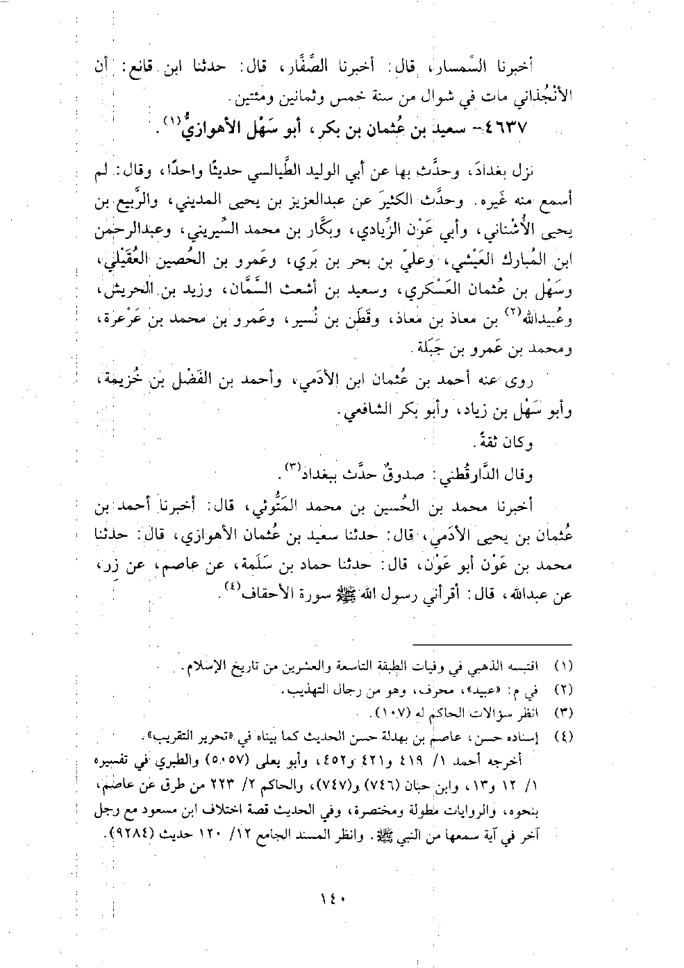 4637 - سعيد بن عثمان بن بكر أبو سهل الأهوازي نزل بغداد، وحدث بها عن أبي الوليد الطيالسي حديثا واحدا واحدا، وقال: لم أسمع منه غيره.