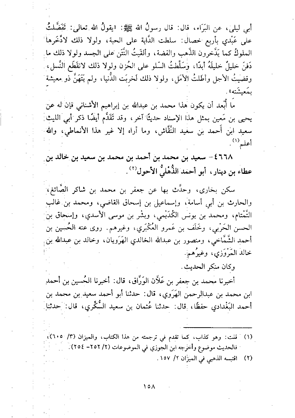 (3007) -[10: 158] أَخْبَرَنَا مُحَمَّدُ بْنُ جَعْفَرِ بْنِ عَلانَ الْوَرَّاقُ، قَالَ: أَخْبَرَنَا الْحُسَيْنُ بْنُ أَحْمَدَ بْنِ مُحَمَّدِ بْنِ عَبْدِ الرَّحْمَنِ الْهَرَوِيُّ، قَالَ: حَدَّثَنَا أَبُو أَحْمَدَ سَعِيدُ بْنُ مُحَمَّدِ بْنِ أَحْمَدَ الْبَغْدَادِيُّ، حِفْظًا، قَالَ: حَدَّثَنَا عُثْمَانُ بْنُ سَعِيدٍ السُّكَّرِيُّ، قَالَ: حَدَّثَنَا الأَصْمَعِيُّ، قَالَ: حَدَّثَنَا أَبِي، عَنْ نَافِعٍ، عَنِ ابْنِ عُمَرَ، قَالَ: قَالَ رَسُولُ اللَّهِ صَلَّى اللَّهُ عَلَيْهِ وَسَلَّمَ: " مَنْ أَتَى الْجُمُعَةَ فَلْيَغْتَسِلْ " أَخْبَرَنِي أبو الوليد الدربندي، قال: أَخْبَرَنَا أبو عبد الله محمد بن أحمد بن محمد بن سليمان الحافظ ببخارى، قال: أبو أحمد سعيد بن محمد بن أحمد بن محمد بن سعيد بن خالد بن عطاء بن دينار الذهلي البغدادي الأحول صاحب عجائب، سكن بخارى، ثم خرج إلى بلخ، ومات بها سنة تسع وأربعين وثلاث مائة.