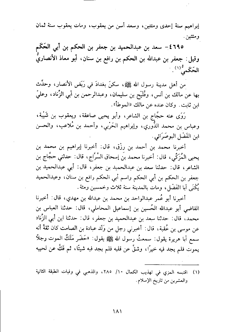 أَخْبَرَنِي أحمد بن سليمان بن علي المقرئ، قال: حَدَّثَنَا عبد الرحمن بن عمر الخلال، قال: حَدَّثَنَا محمد بن أحمد بن يعقوب، قال: حَدَّثَنَا جدي، قال: حَدَّثَنِي أبو معاذ الحكمي سعد بن عبد الحميد بن جعفر المديني ثقة صدوق.