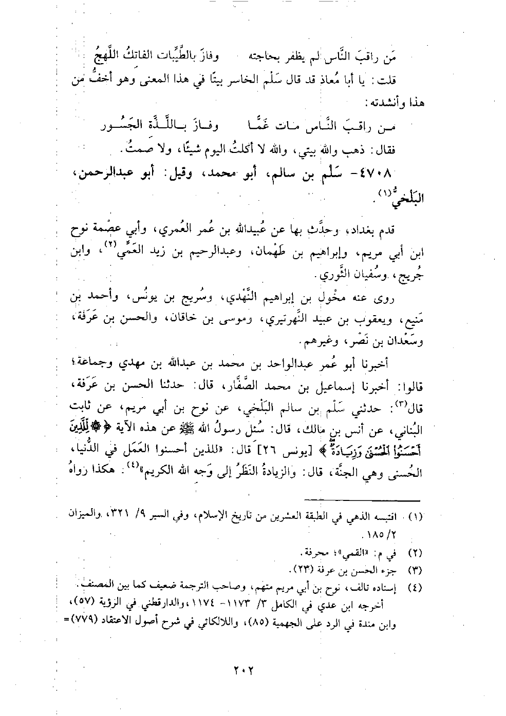 (3036) -[10: 202] أَخْبَرَنَا أَبُو عُمَرَ عَبْدُ الْوَاحِدِ بْنُ مُحَمَّدِ بْنِ عَبْدِ اللَّهِ بْنِ مَهْدِيٍّ وَجَمَاعَةٌ، قَالُوا: أَخْبَرَنَا إِسْمَاعِيلُ بْنُ مُحَمَّدٍ الصَّفَّارُ، قَالَ: حَدَّثَنَا الْحَسَنُ بْنُ عَرَفَةَ، قَالَ: حَدَّثَنِي سَلْمُ بْنُ سَالِمٍ الْبَلْخِيُّ، عَنْ نُوحِ بْنِ أَبِي مَرْيَمَ، عَنْ ثَابِتٍ الْبُنَانِيِّ، عَنْ أَنَسِ بْنِ مَالِكٍ، قَالَ: سُئِلَ رَسُولُ اللَّهِ صَلَّى اللَّهُ عَلَيْهِ وَسَلَّمَ عَنْ هَذِهِ الآيَةِ: {لِلَّذِينَ أَحْسَنُوا الْحُسْنَى وَزِيَادَةٌ}، قَالَ: لِلَّذِينَ أَحْسَنُوا الْعَمَلَ فِي الدُّنْيَا، الْحُسْنَى وَهِيَ الْجَنَّةُ، قَالَ: وَالزِّيَادَةُ النَّظَرُ إِلَى وَجْهِ اللَّهِ الْكَرِيمِ "، هَكَذَا رَوَاهُ سَلْمٌ عَنْ نُوحِ بْنِ أَبِي مَرْيَمَ عَنْ ثَابِتٍ الْبُنَانِيِّ عَنْ أَنَسٍ، وَهُوَ خَطَأٌ، وَالصَّوَابُ عَنْ ثَابِتٍ عَنْ عَبْدِ الرَّحْمَنِ بْنِ أَبِي لَيْلَى عَنْ صُهَيْبٍ عَنِ النَّبِيِّ صَلَّى اللَّهُ عَلَيْهِ وَسَلَّمَ رَوَاهُ حَمَّادُ بْنُ سَلَمَةَ وَكَانَ أَثْبَتَ النَّاسِ فِي ثَابِتٍ قلت: وكان سلم مذكورا بالعبادة والزهد، خشن الطريقة، وكان يذهب إلى الإرجاء أَخْبَرَنِي علي بن أحمد الرزاز، قال: أَخْبَرَنَا حامد بن محمد الهروي، قال: سمعت أبا زكريا يحيى بن عبد الله بن ماهان، يقول: سمعت محمد بن إسحاق، هو اللؤلئي، يقول: رأيت سلم بن سالم مكث أربعين سنة لم نر له فراشا، ولم ير مفطرا إلا يوم فطر أو أضحى، ولم يرفع رأسه إلى السماء أكثر من أربعين سنة.
