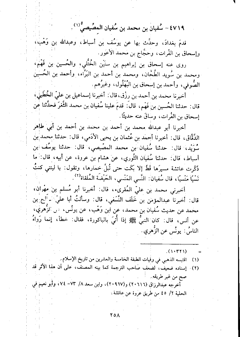 4719 - سفيان بن محمد بن سفيان المصيصي قدم بغداد، وحدث بها عن يوسف بن أسباط، وعبد الله بن وهب، وإسحاق بن الفرات، وحجاج بن محمد الأعور.