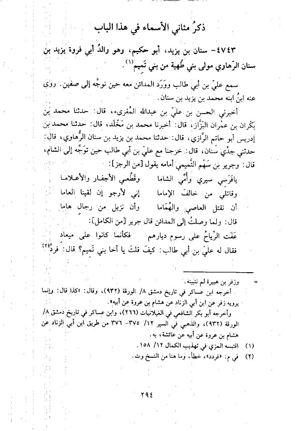 (3060) أَخْبَرَنِي الْحَسَنُ بْنُ عَلِيِّ بْنِ عَبْدِ اللَّهِ الْمُقْرِئُ، قَالَ: حَدَّثَنَا مُحَمَّدُ بْنُ بَكْرَانَ بْنِ عِمْرَانَ الْبَزَّازُ، قَالَ: أَخْبَرَنَا مُحَمَّدُ بْنُ مَخْلَدٍ، قَالَ: حَدَّثَنَا مُحَمَّدُ بْنُ إِدْرِيسَ الرَّازِيُّ، قَالَ: حَدَّثَنَا مُحَمَّدُ بْنُ يَزِيدَ بْنِ سِنَانٍ الرُّهَاوِيُّ، قَالَ: حَدَّثَنِي جَدِّي سِنَانٌ، قَالَ: خَرَجْنَا مَعَ عَلِيِّ بْنِ أَبِي طَالِبٍ حِينَ تَوَجَّهَ إِلَى الشَّامِ، قَالَ: وَجَرِيرُ بْنُ سَهْمٍ التَّمِيمِيُّ أَمَامَهُ، يَقُولُ: الْعَاصِي إِلَى الْمَدَائِنِ قَالَ جَرِيرٌ: عَلِيُّ بْنُ أَبِي طَالِبٍ: كَيْفَ قُلْتَ يَا أَخَا بَنِي تَمِيمٍ؟ قَالَ: فَرَدَّ عَلَيْهِ الْبَيْتَ، قَالَ: