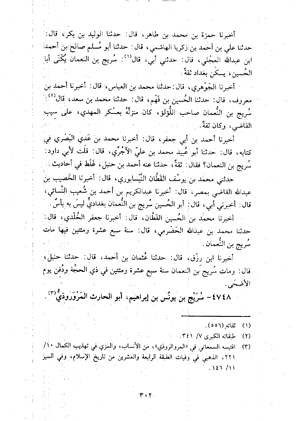 4748 - سريج بن يونس بن إبراهيم أبو الحارث المروروذي سكن بغداد، وحدث بها عن سفيان بن عيينة، وهشيم، وابن علية، وعباد بن عباد، ومروان بن شجاع، وإسماعيل بن جعفر، وعمر بن عبيد، وسلم بن سالم، وإبراهيم بن خثيم بن عراك.