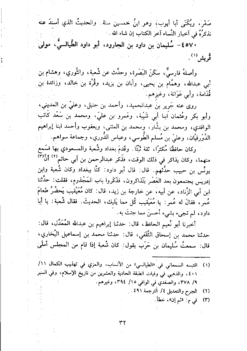 4570 - سليمان بن داود بن الجارود أبو داود الطيالسي مولى قريش وأصله فارسي، سكن البصرة، وحدث عن شعبة، والثوري، وهشام بن أبي عبد الله، وهمام بن يحيى، وأبان بن يزيد، وقرة بن خالد، وزائدة بن قدامة، وأبي عوانة، وغيرهم.