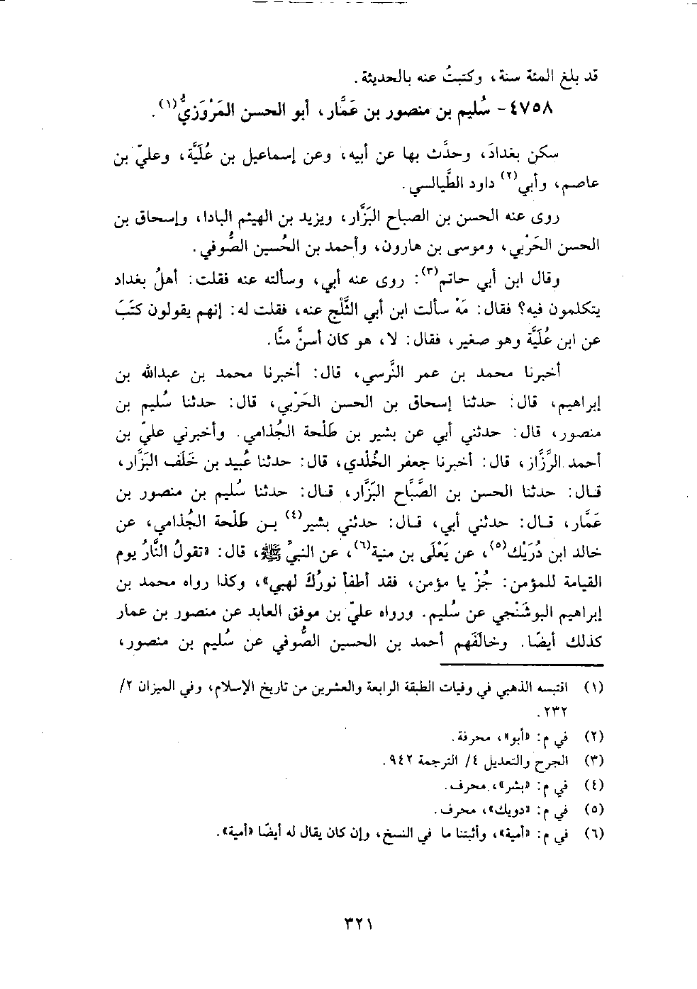 4758 - سليم بن منصور بن عمار أبو الحسن المروزي سكن بغداد، وحدث بها عن أبيه، وعن إسماعيل ابن علية، وعلي بن عاصم، وأبي داود الطيالسي.